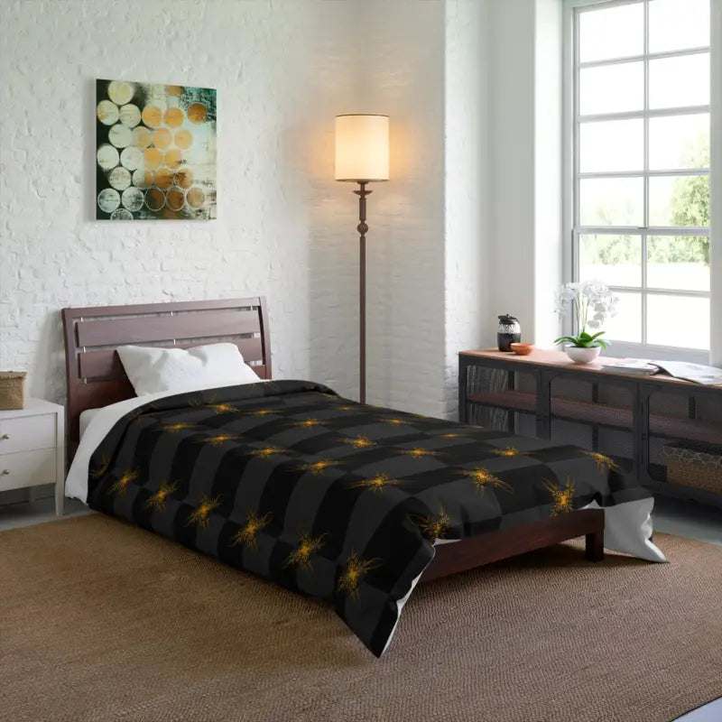 Unique gold pattern on grey, Comforter. Comfy, fluffy, and warm. Cozy up underneath our snug blanket for a deep and relaxing sleep. Highlight these premium quality blankets with some unique designs and your home will be lit up with them. This blanket is the perfect solution for cold days in bed with coffee, waiting for the morning light to peak through the window and wake up the house.
