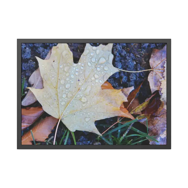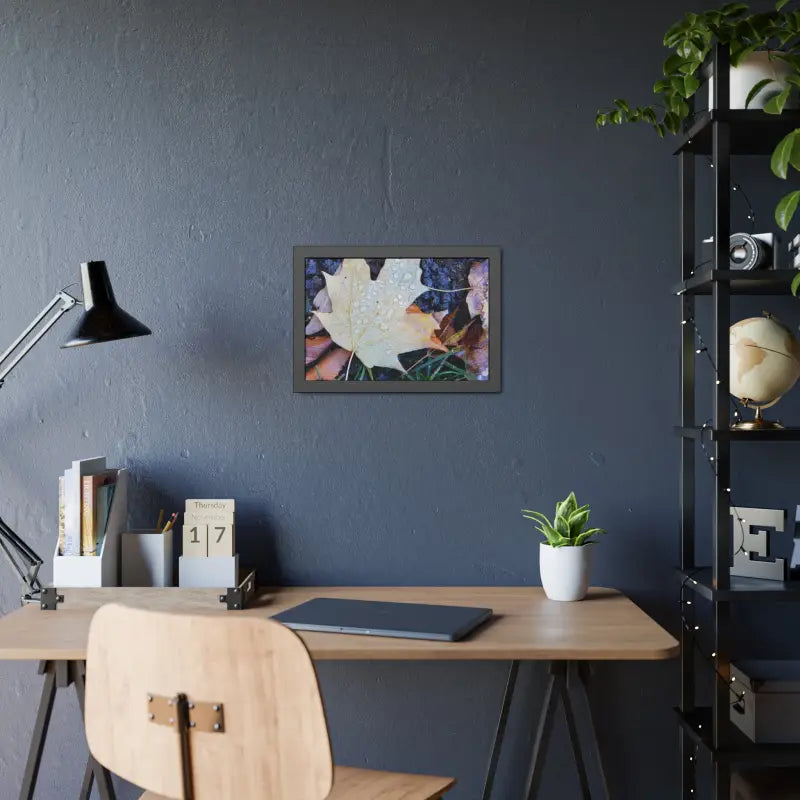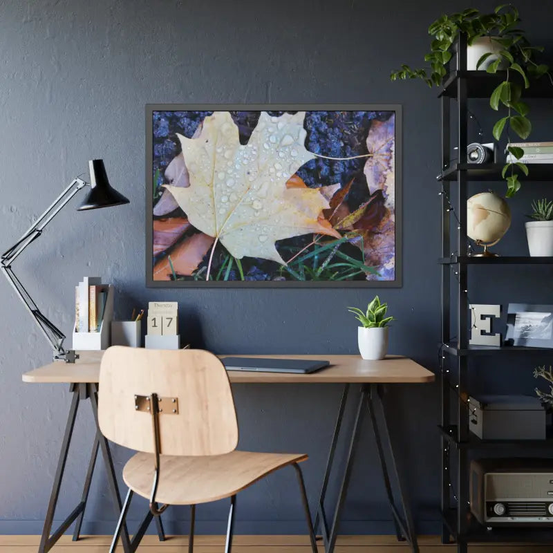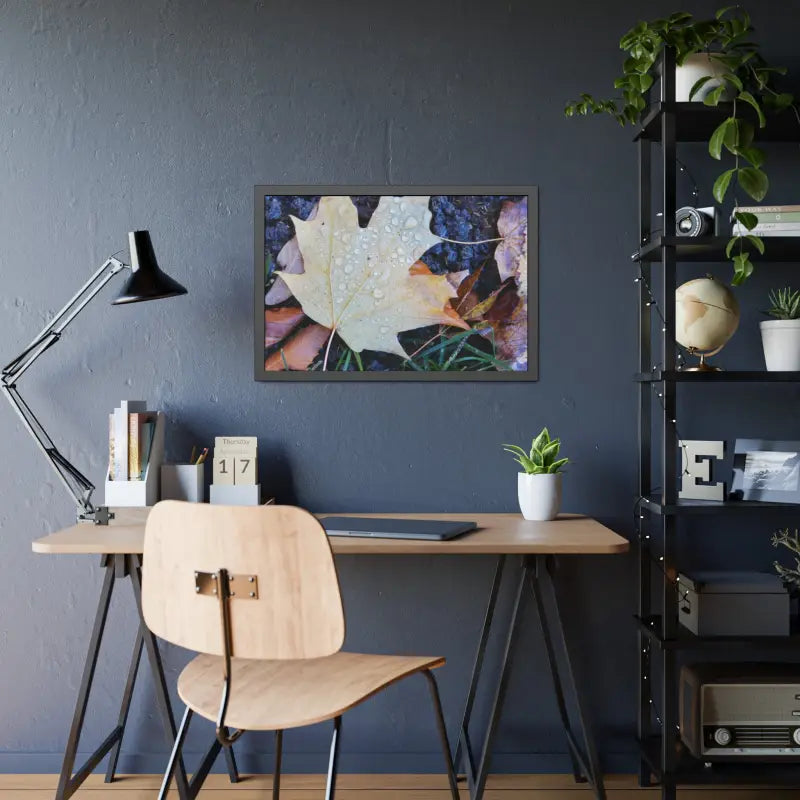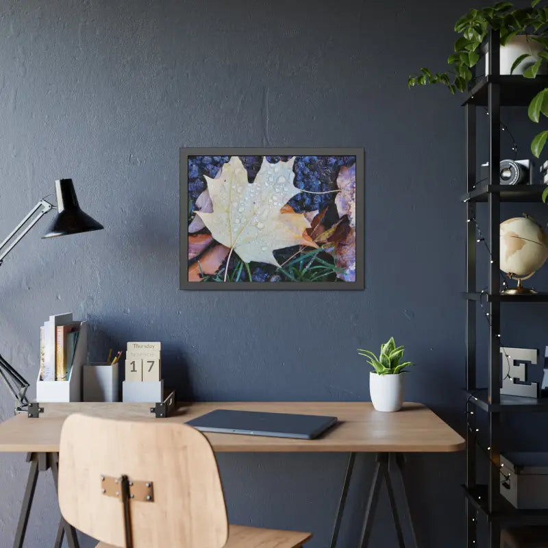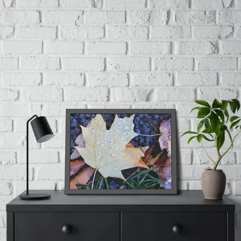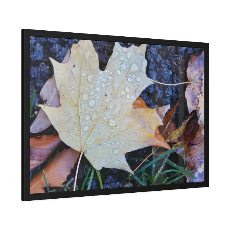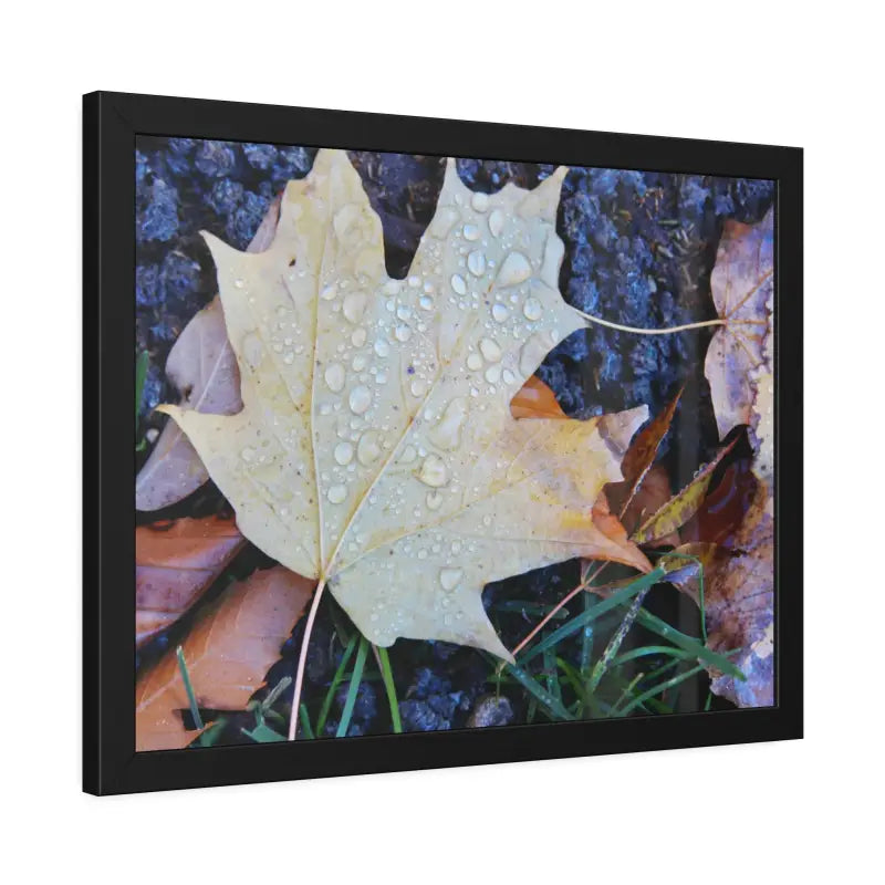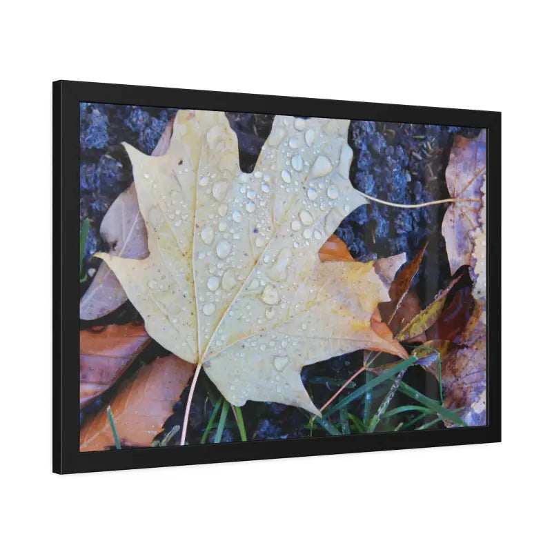 Water drops on a maple leaf, Framed Paper Posters. Meet the perfect art into decor that makes all the difference. Each poster is made with 310gsm fine-art paper or 250gsm semi-gloss paper and comes in multiple sizes so that you can find the perfect match for your art. The posters ship with a pinewood frame that has a stylish black finish, and pre-installed hanging hardware with rubber bumpers. The whole piece is protected with shatterproof plexiglass.