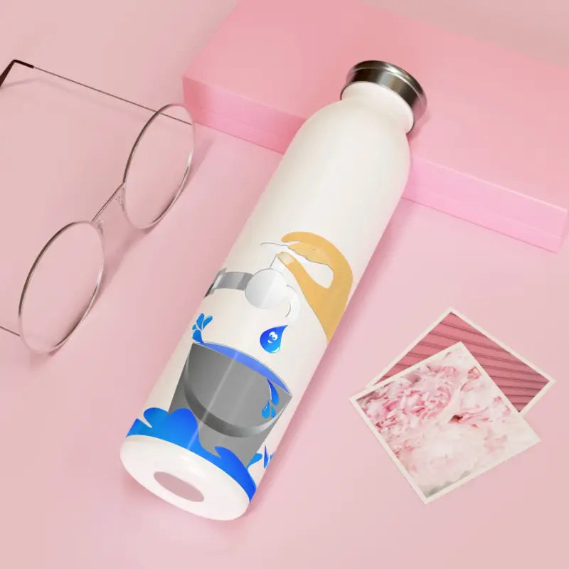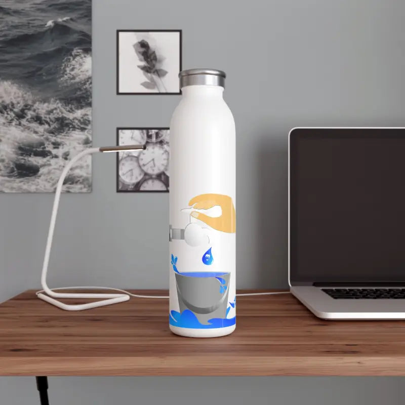 Water tap, Slim Water Bottle. Introducing your new favorite water bottle! Designed with your lifestyle in mind, this sleek bottle boasts a generous 20oz (0.60 l) capacity, making it perfect for staying hydrated on the go. Its chic lid adds a touch of fashion to your daily accessories, while the double-wall stainless steel frame with a matte finish ensures durability and style. Utilizing vacuum insulation technology, this bottle keeps your beverages at their ideal temperature for hours on end, whether it's piping hot coffee or refreshing cold water. Complete with a silver cap for added convenience and a glossy print for extra flair, this water bottle is a must-have for anyone who values both function and fashion.