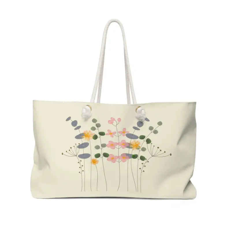 Feel the sun on your skin as you sling this oversized polyester weekender over your shoulder and step onto the sand. The generous canvas of wild flowers pops against seaside skies, making every getaway a picture-perfect moment with a polyester weekender bag that’s built for real life.