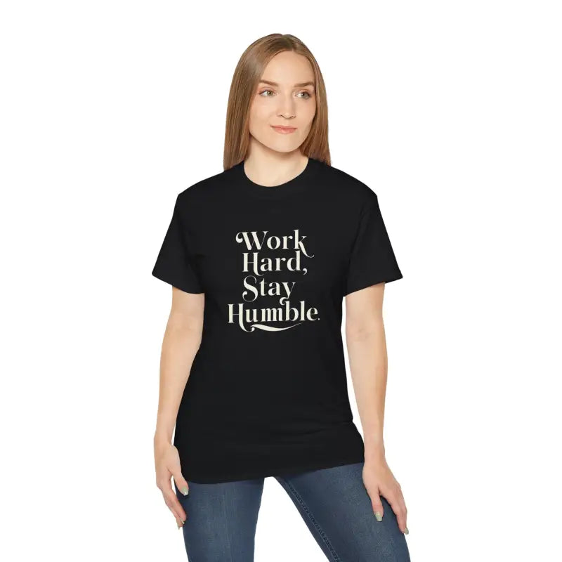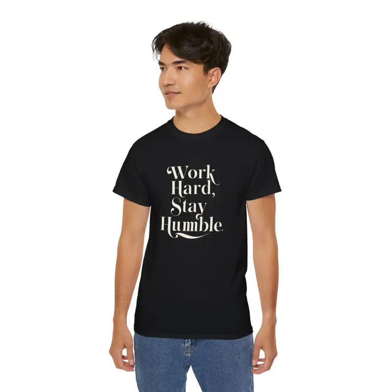Unleash the power of a positive mindset and killer fashion. This work hard and stay humble t-shirt delivers not just standout style but also unstoppable energy—make it yours now and lead with both ambition and grace.