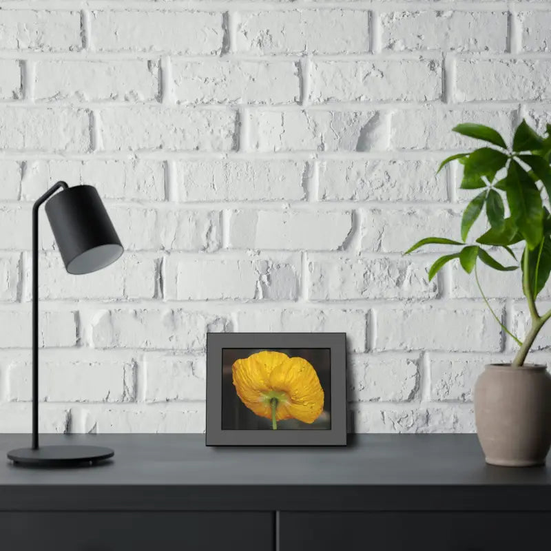 Print: Brilliant yellow poppy flower art on premium framed paper poster, bursting with rich color and radiant design.