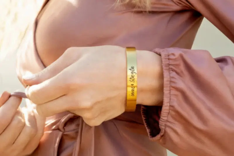 Strength Engraved Cuff Bracelet – Golden Glow Empowerment