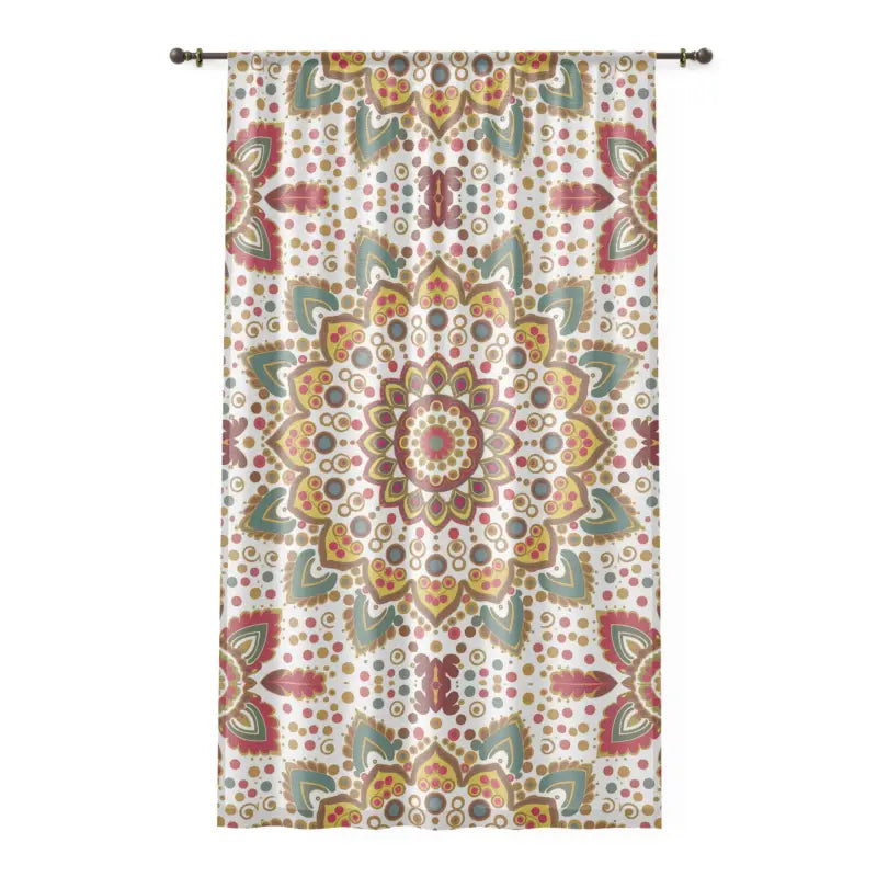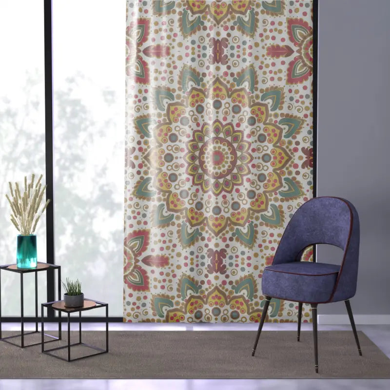 Intricate geometrical mandala pattern, Window Curtain. Home decor - the one factor that can make a house truly feel like home. Add character to any type of surroundings with these beautiful curtains. Measuring in at 50" by 84", these curtains can decorate your window with unique artwork. Made 100% with polyester, they're somewhat transparent so as to soften outside light and add elegance to the room.