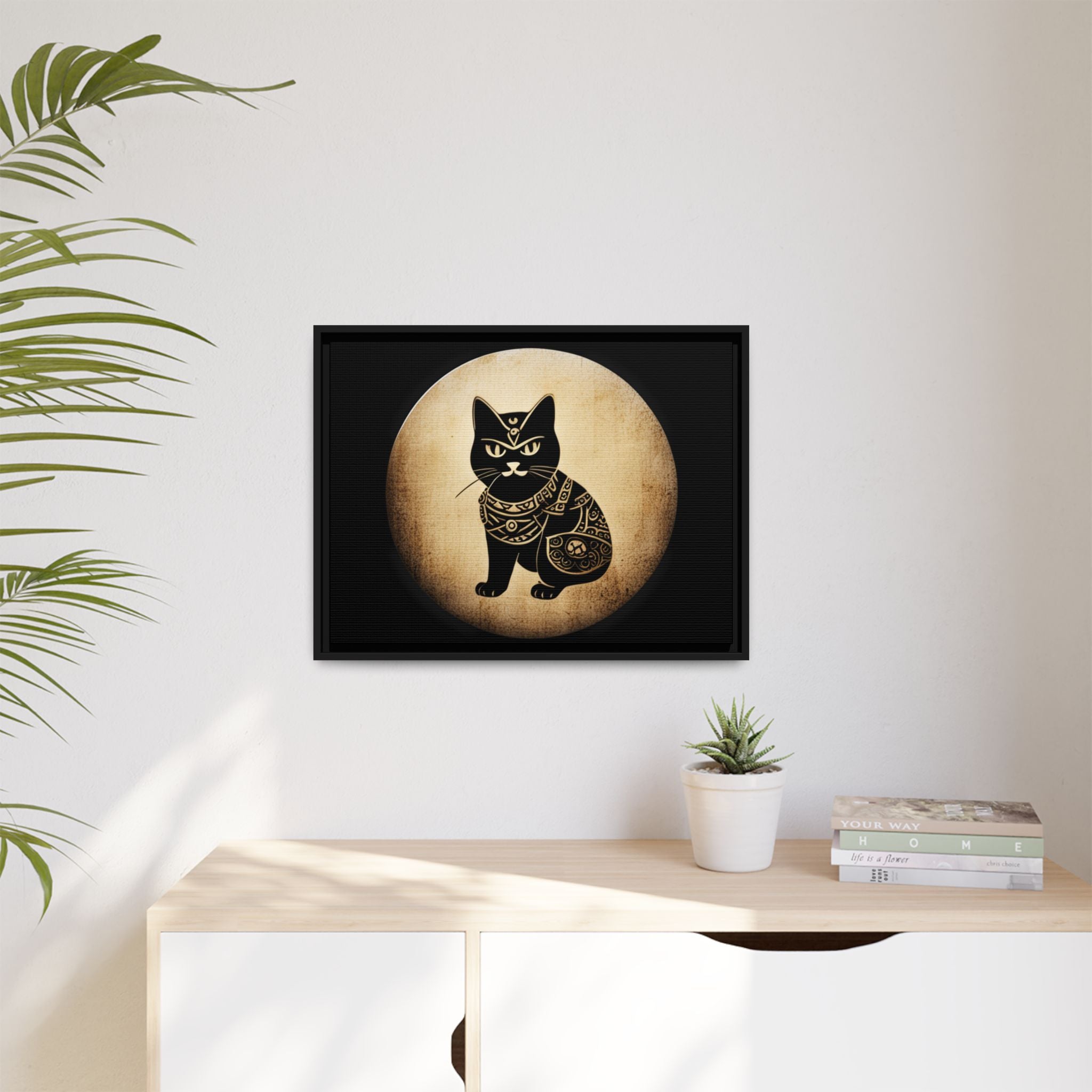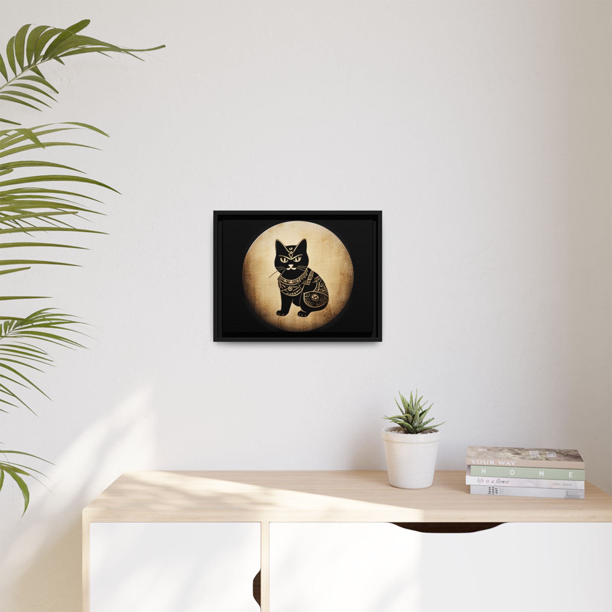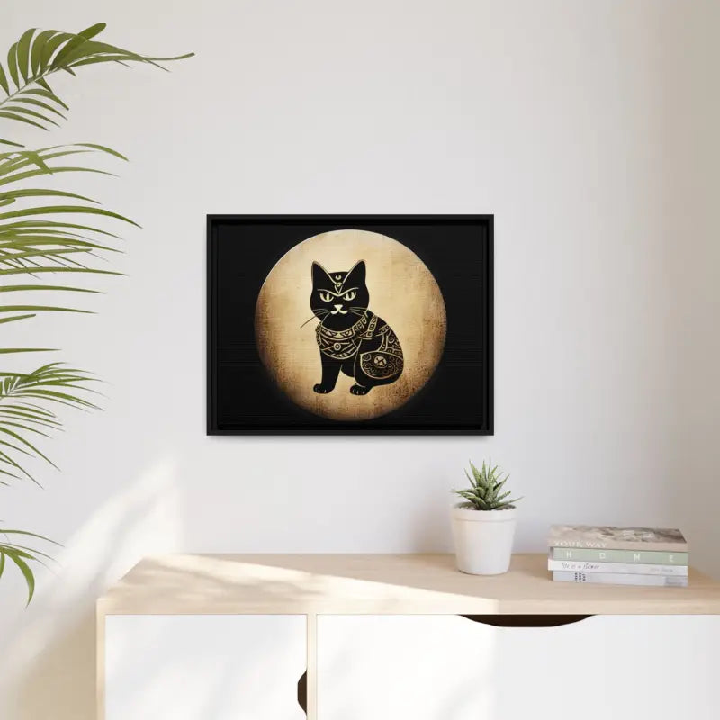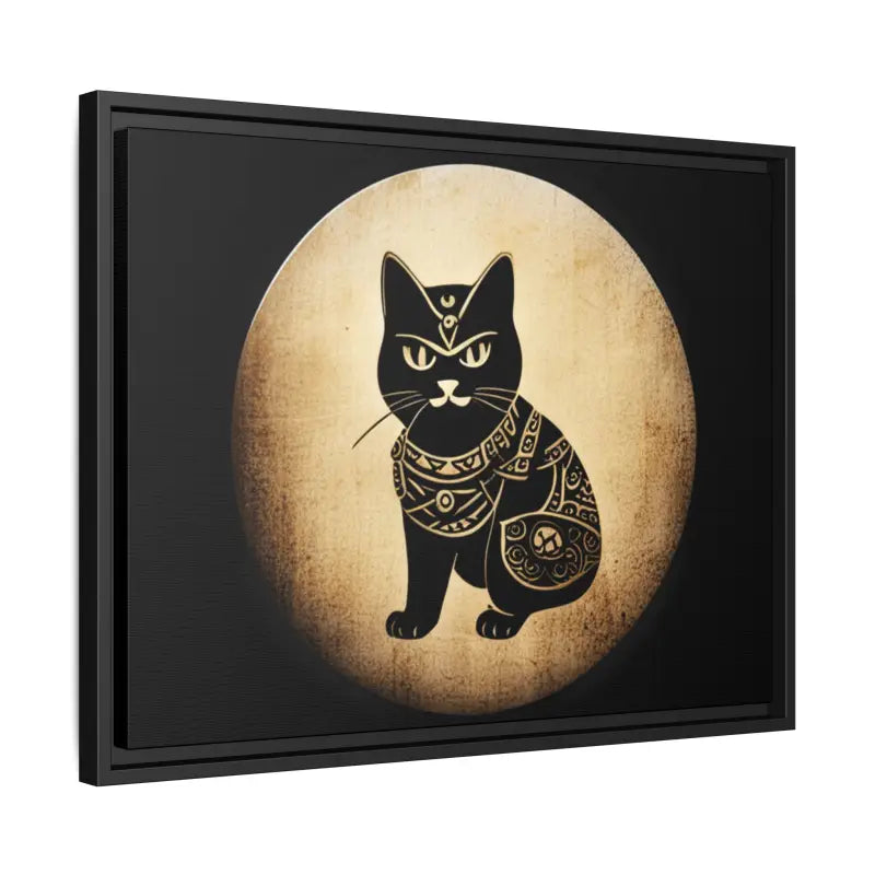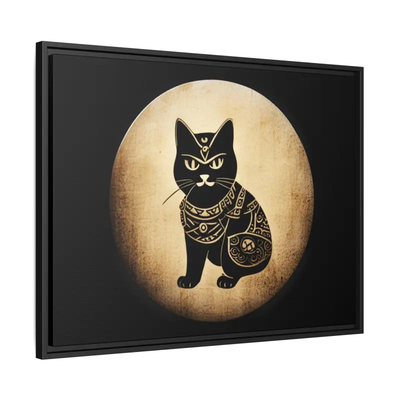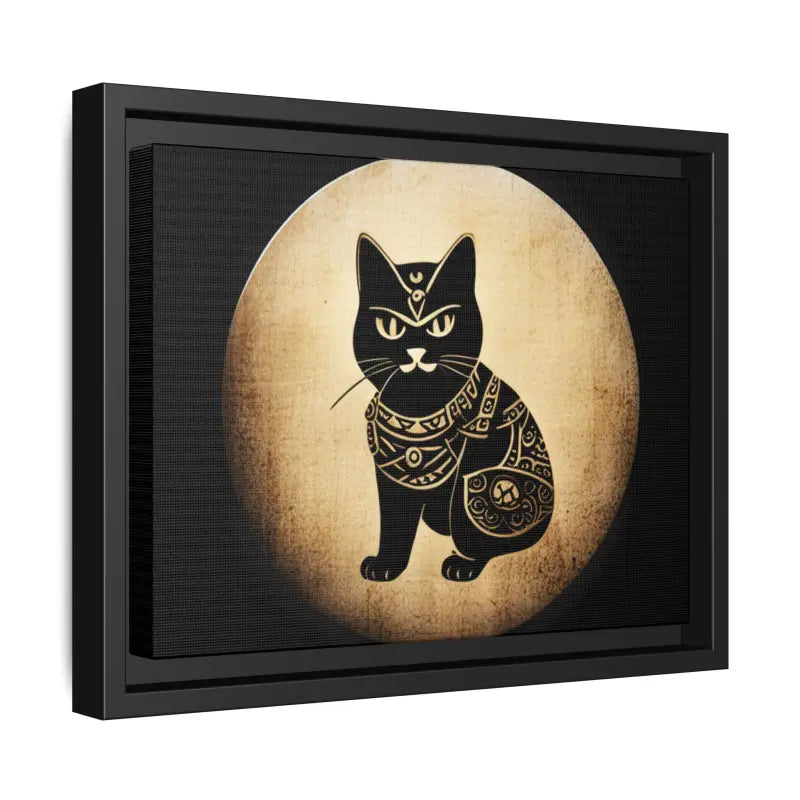 Japanese Samurai Cat Tattoo, Kawaii Ninja Cat in a vintage look, Matte Canvas, Black Frame. Every print in a black pinewood frame will look sleek and beautiful on any interior. The print is on cotton-polyester canvas with a special proprietary coating to make sure your designs stay vibrant for ages. An excellent product for your environmentally-conscious buyers – it's made from sustainably sourced materials (Forest Stewardship Council certified). Choose between multiple sizes for different types of prints. The sawtooth hanging hardware is already attached.
