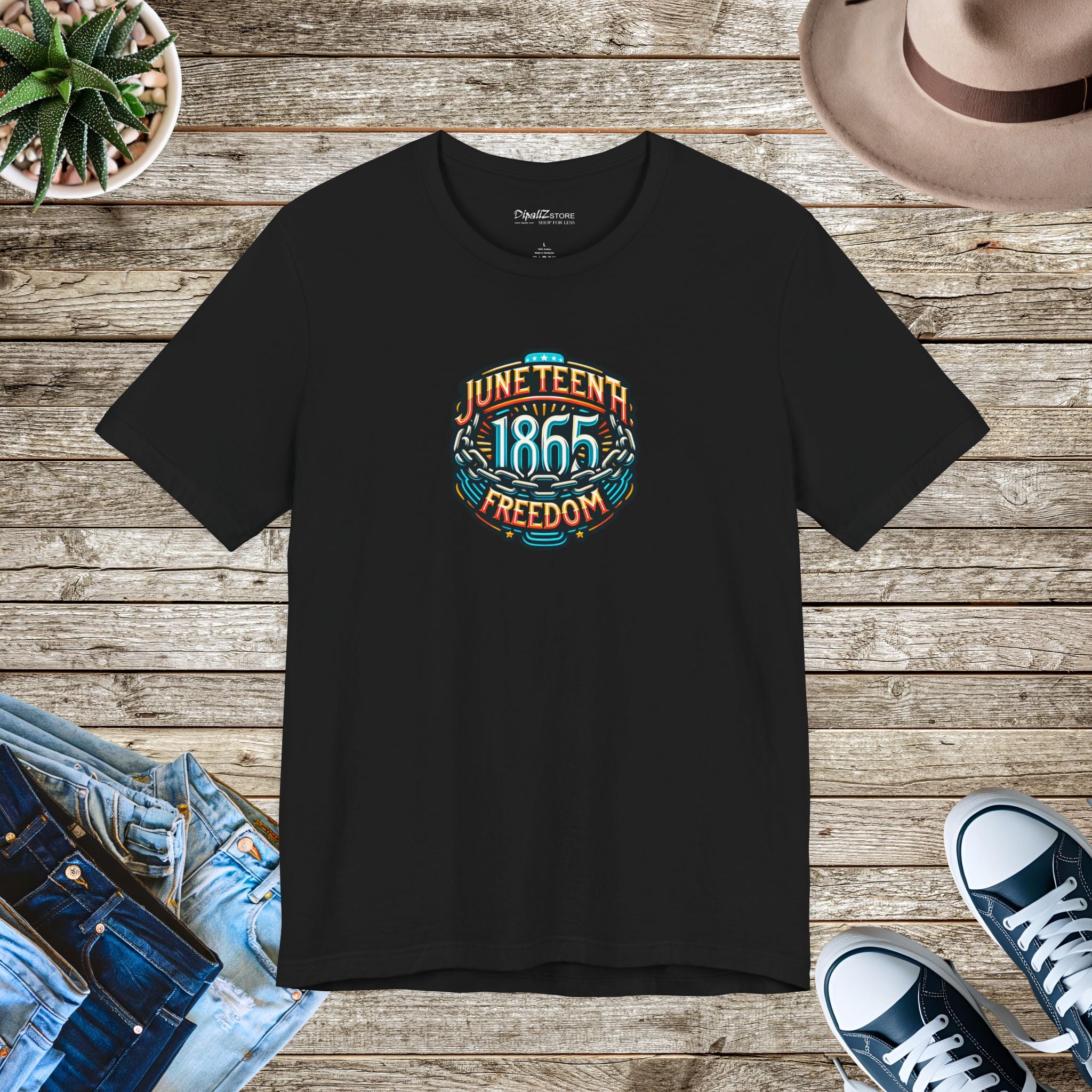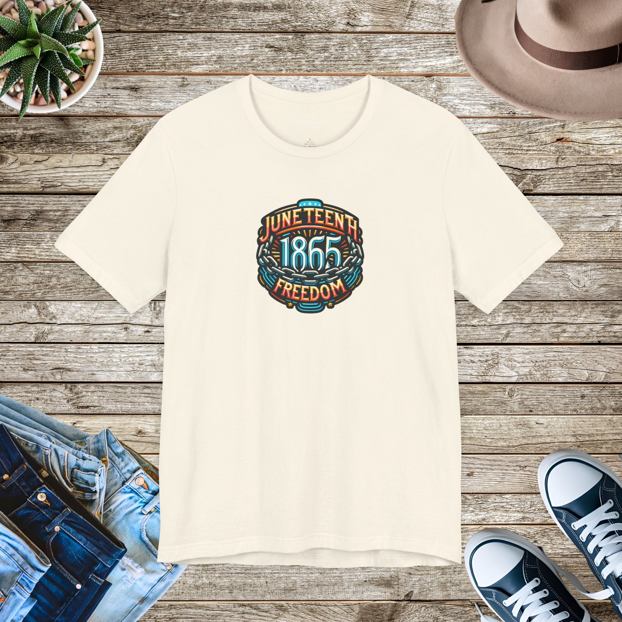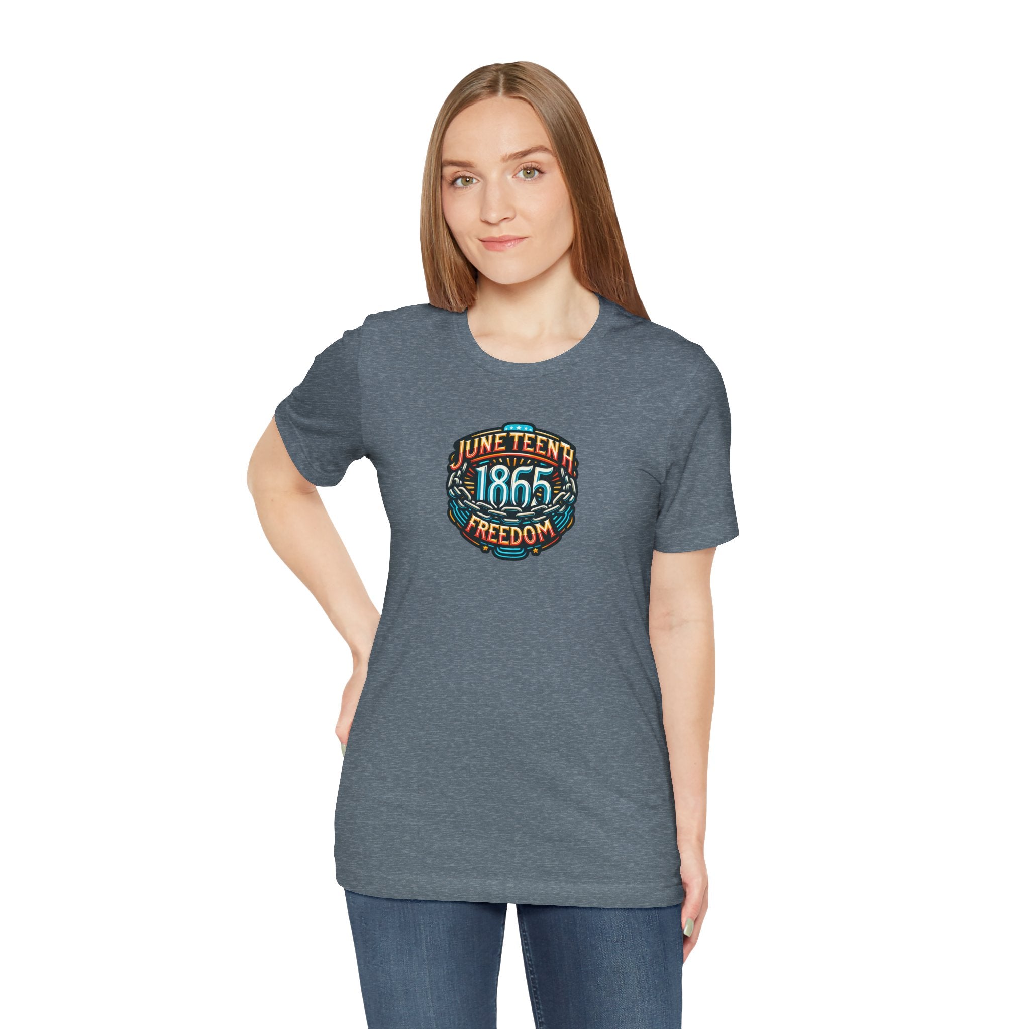 Juneteenth, Unisex Jersey Short Sleeve Tee. This classic unisex jersey short sleeve tee fits like a well-loved favorite. Soft cotton and quality print make users fall in love with it over and over again. These t-shirts have-ribbed knit collars to bolster shaping. The shoulders have taping for better fit over time. Dual side seams hold the garment's shape for longer.