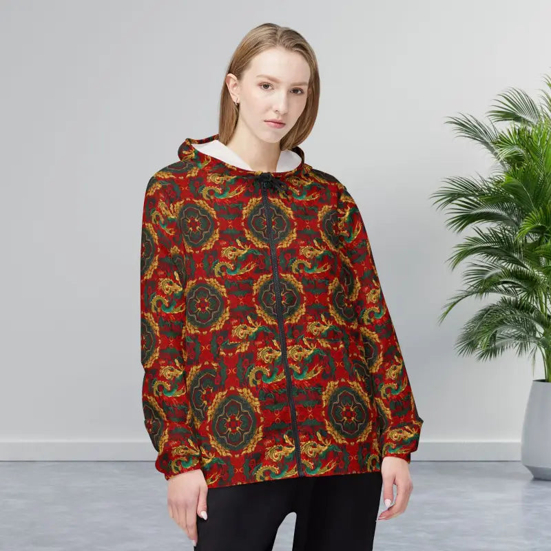 Kaleidoscope Floral Windbreaker Jacket – Vintage Red Boho Pattern, All-Over Print. This lightweight windbreaker brings a warm, hand-crafted energy to rainy commutes and city evenings. The deep, autumnal palette and kaleidoscopic medallion pattern feel like a worn textile rediscovered in a vintage market — familiar, textured, and quietly bold. Throw it on when streets are slick and the air smells of wood smoke; the water- and wind-resistant shell keeps you moving while the elastic cuffs lock in comfort. The full zipper and roomy front pockets offer practical ease, and the vibrant all-over print holds its color through wear, turning functional outerwear into a wearable story.