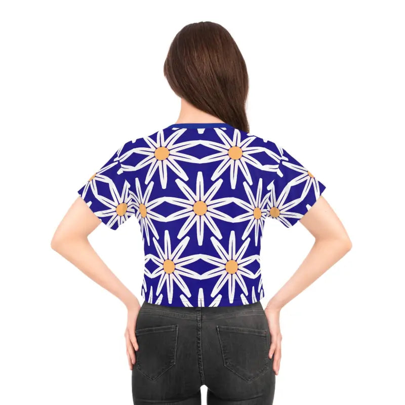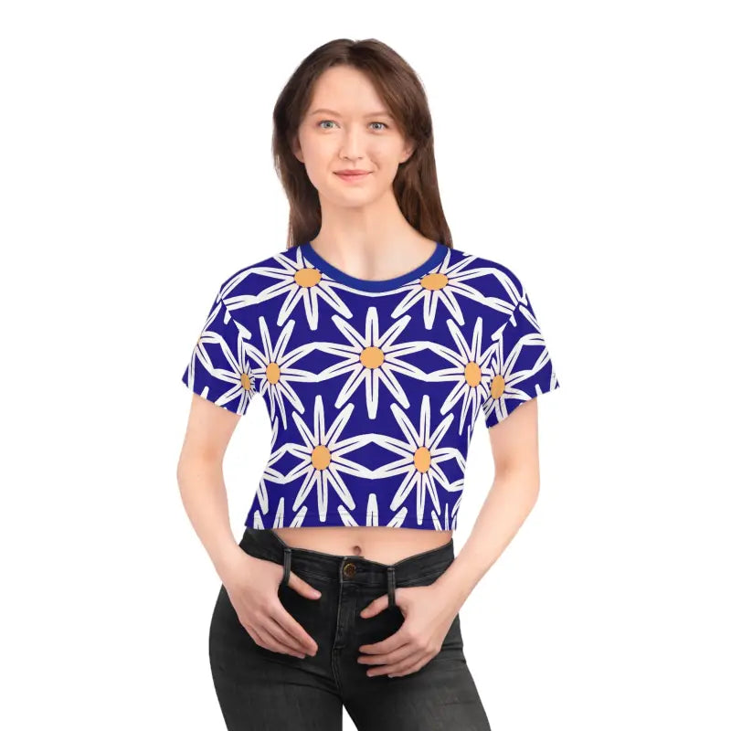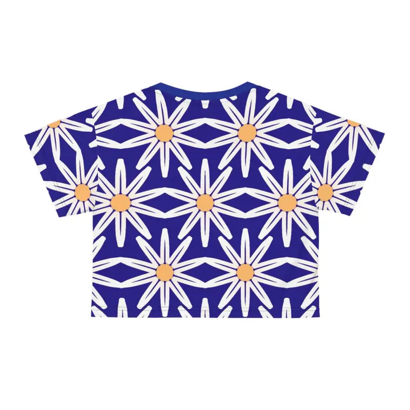 Get ready to transform your wardrobe and steal the scene with the Bloom in Style: Large White Flowers Aop Crop Tee. This chic and vibrant crop tee is designed for those who aren't afraid to stand out and make a lasting impression. It's not just a stylish garment; it's an invitation to express yourself with every wear. The mesmerizing contrast of bold blue backgrounds laced with large white flowers captures the essence of elegance and grace, offering a nod to nature that's both lively and sophisticated.