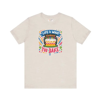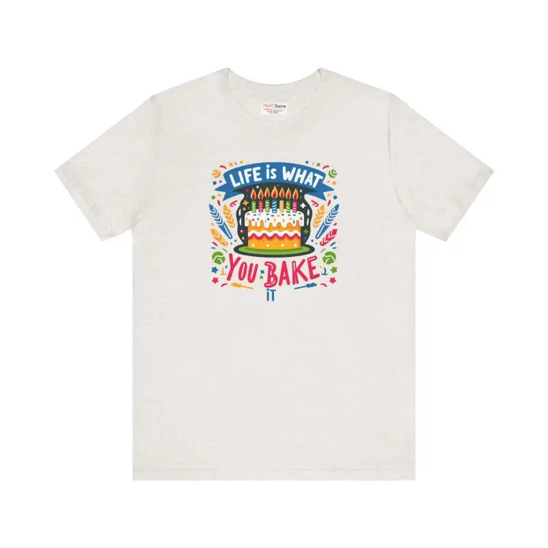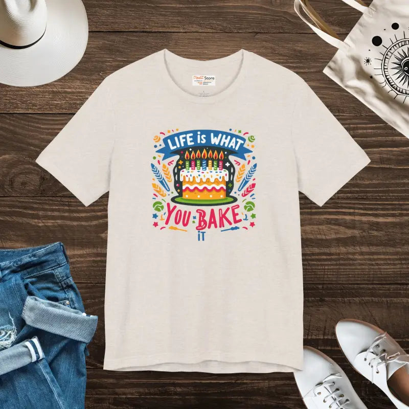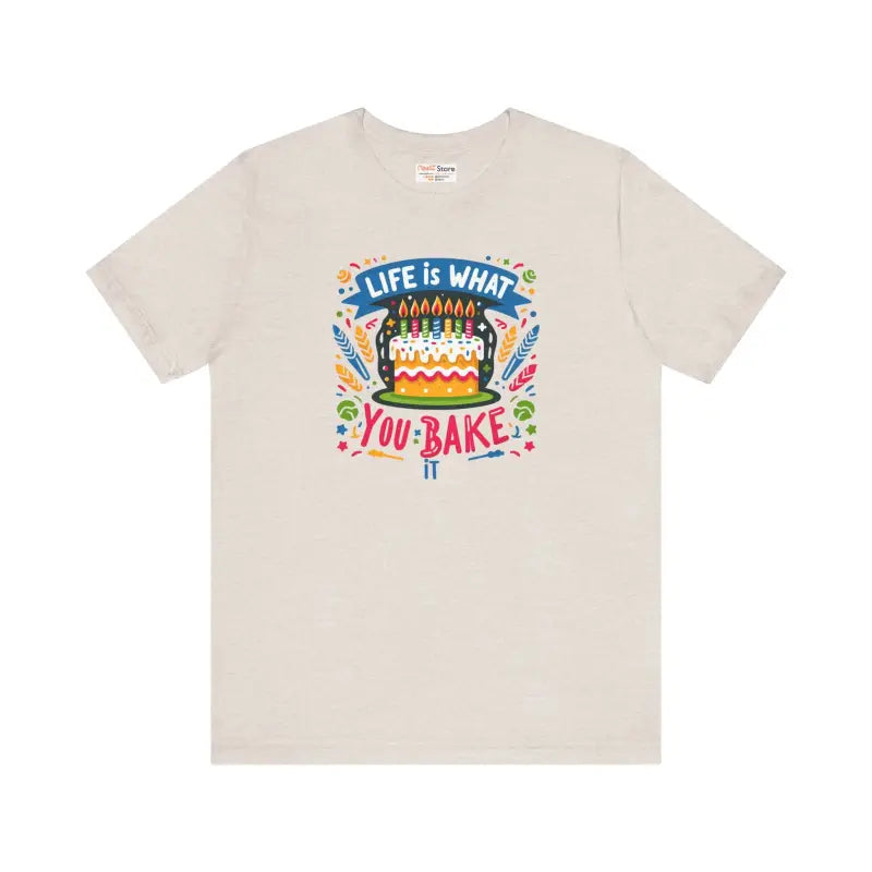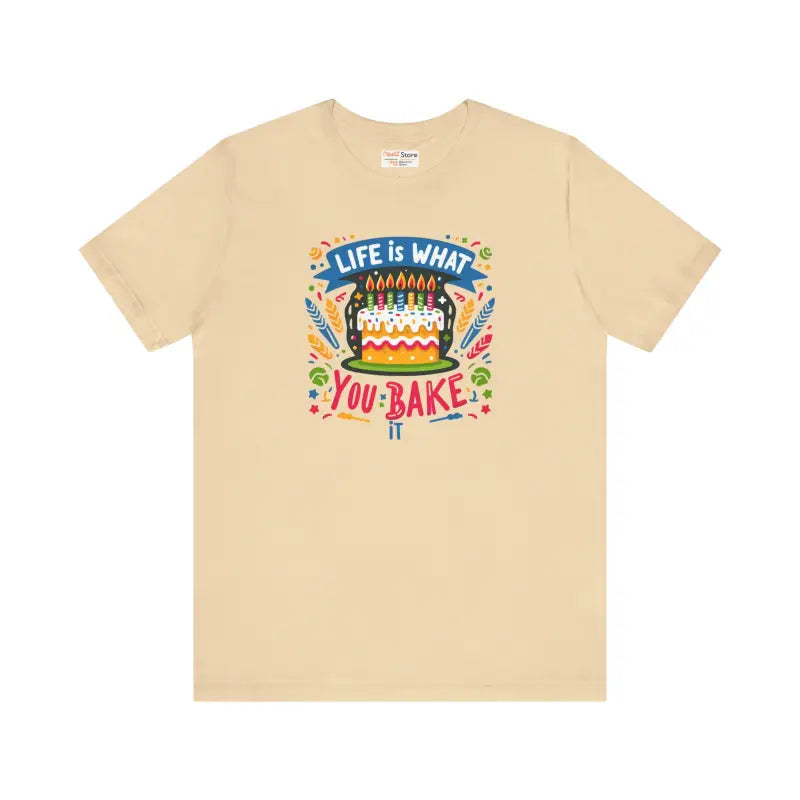 Print: Life is What You Bake It graphic that bursts with positivity, creativity, and a playful spirit designed in 150 characters.