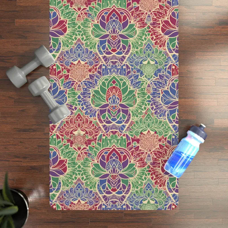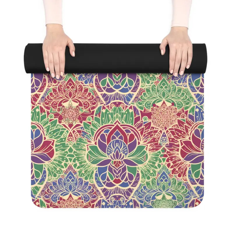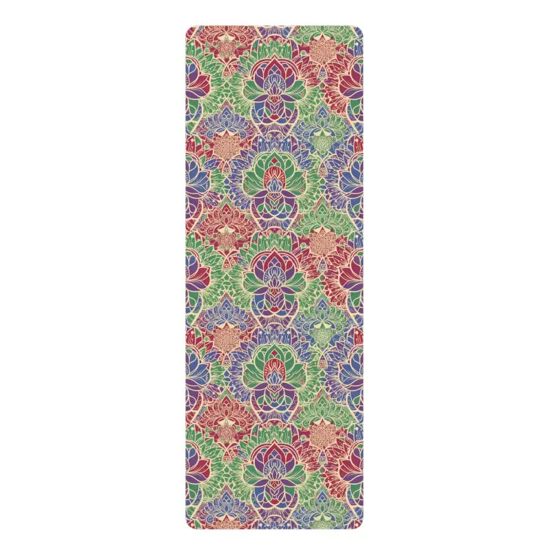 This eye-catching floral rubber yoga design features intricate lotus-inspired patterns that bloom across the entire surface, creating a personal sanctuary wherever you unroll it. The vibrant mandala motifs radiate from center to edge in rich, hand-drawn detail that makes every session feel special.