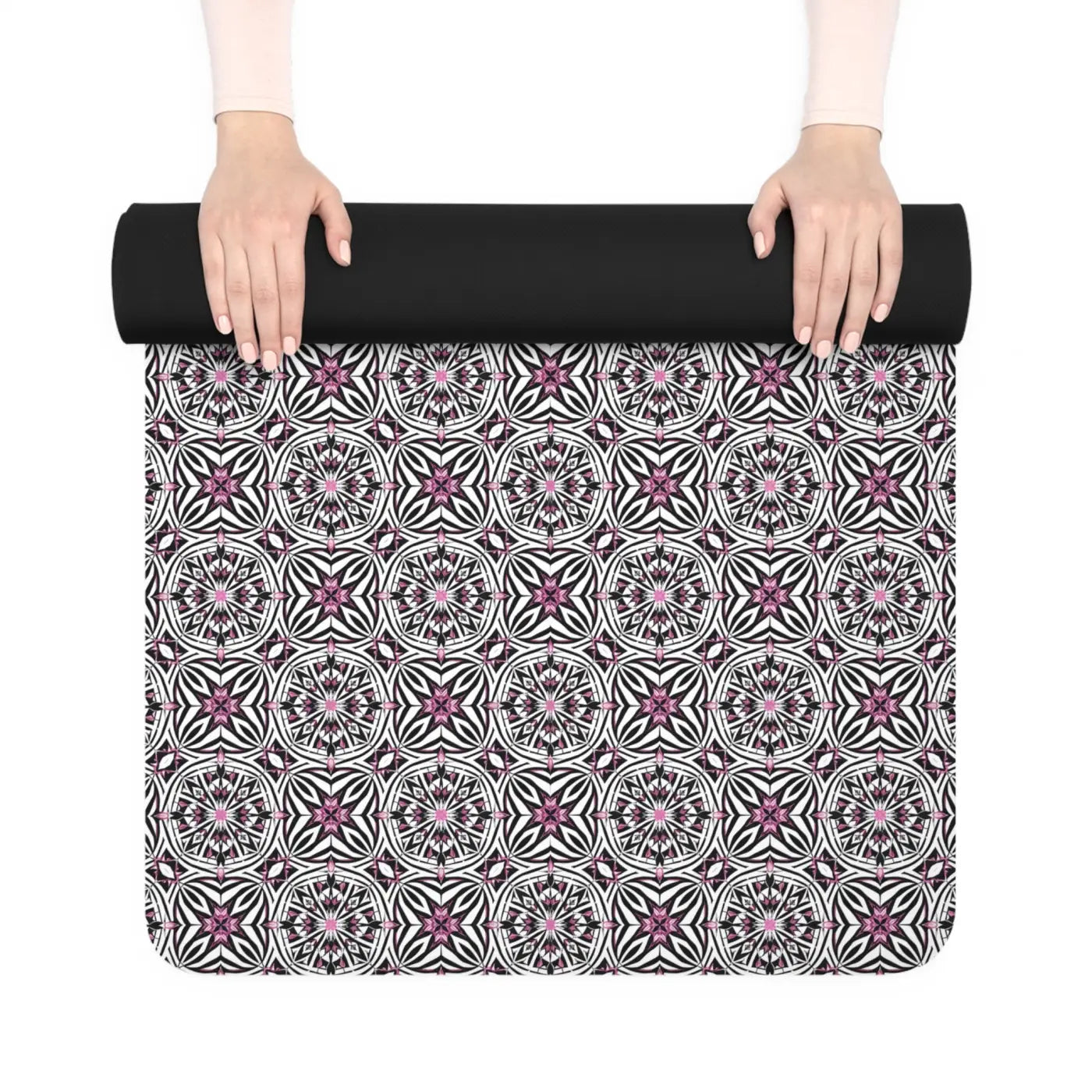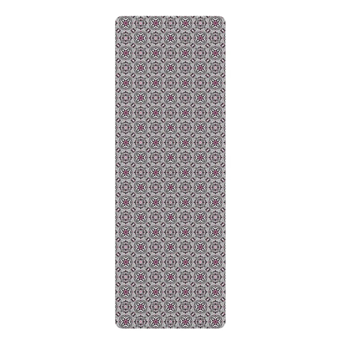 This lightweight yoga mat brings calm focus to your daily practice with a refined, repeating mandala pattern in muted rose and slate tones. The microfiber suede surface feels soft under bare feet and grips well for flowing sequences, while the natural rubber backing keeps the mat grounded on studio floors and home tiles. At 24" x 70" and 3mm thick, it’s slim enough to roll easily and pack with the included black polyester strap, yet cushioned enough for sun salutations, seated breathwork, and cool-down stretches. The edge-to-edge print gives a polished, studio-ready look that blends into minimalist and bohemian spaces alike. Keep it shaded when not in use to preserve the print’s gentle colors.