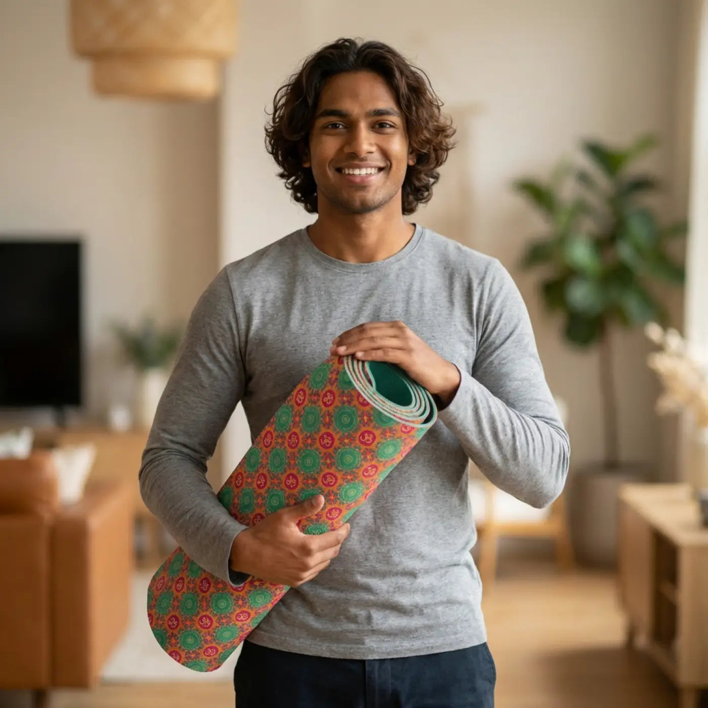 Warm, vibrant, and made for movement — this 3mm rubber yoga mat brings color and comfort to every practice. The microfiber suede top feels soft under hands and feet while the natural rubber bottom grips the floor, keeping the mat steady through flows and stretches. A rich mandala-inspired print runs edge-to-edge, turning your mat into a little altar of calm and focus. When you roll it up, the included black polyester strap makes it easy to carry to classes or to a sunlit corner at home. Gentle, lightweight, and built for everyday use — just keep it out of direct sunlight to preserve the print’s brightness.