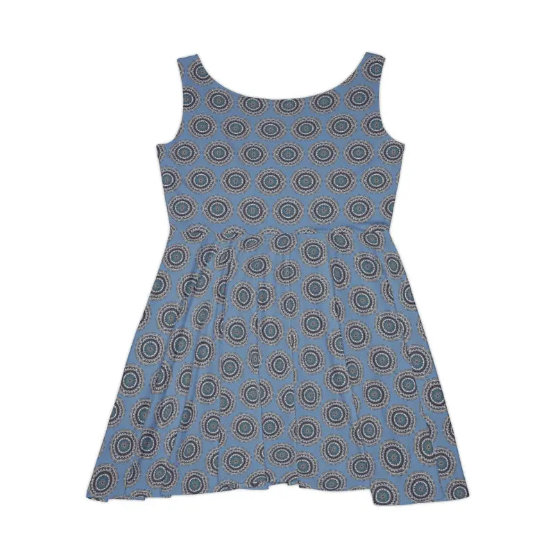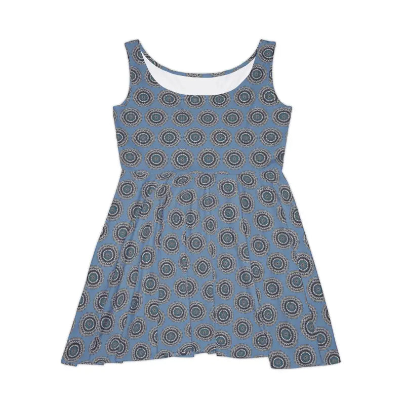Get ready to turn heads in this mandala pattern skater dress that transforms every step into a statement. Bold blue jewel tones swirl across the fabric in mesmerizing circular patterns that catch light and eyes wherever you go.
