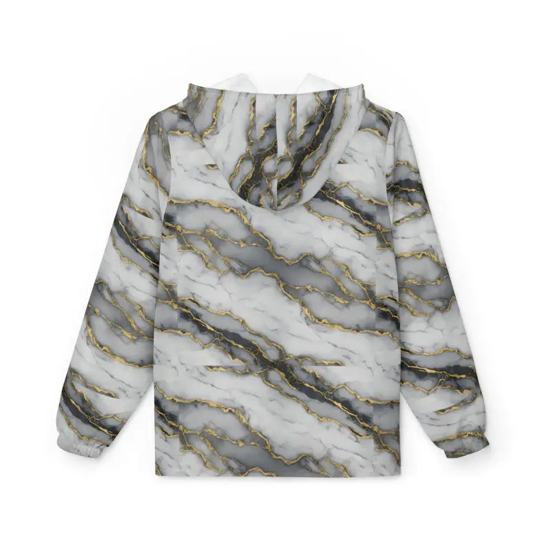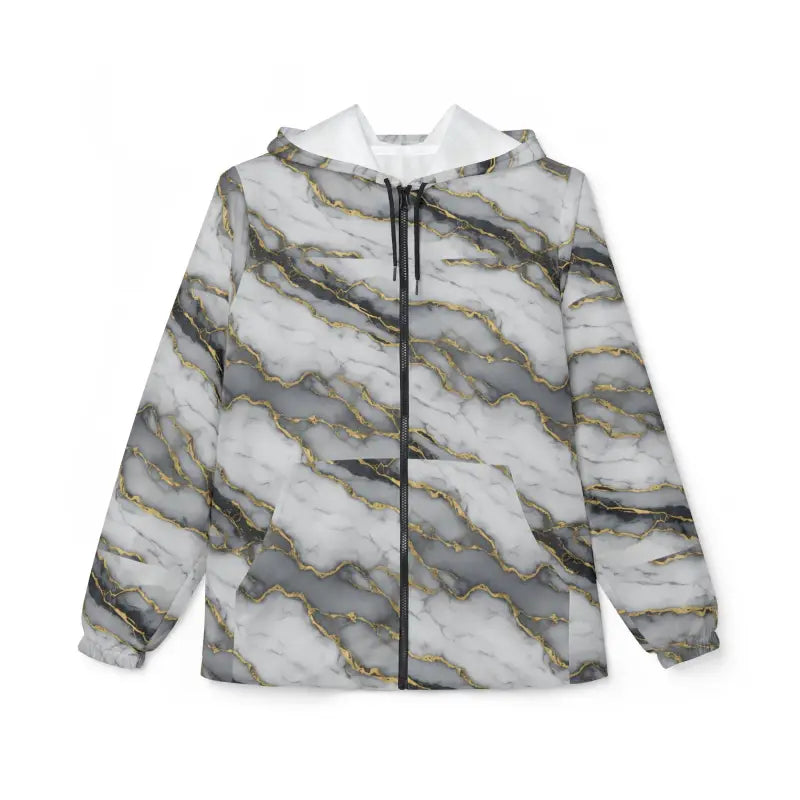 Marble Gold Vein Windbreaker Jacket — Luxe White & Gray Marble Print. This lightweight windbreaker brings the quiet luxury of marble veins into everyday wear. Soft, fast-drying polyester holds a high-contrast white, gray and gold marbled print that reads like stone in motion. The hood and full zipper give flexible coverage when the day is breezy; elastic cuffs keep the silhouette clean and help block gusts. Two roomy side pockets carry small essentials while the water- and wind-resistant fabric keeps you moving through misty sidewalks and breezy shorelines. It fits closer to the body (runs smaller than usual), so size up for layering. Wear it over a tee for morning coffee runs or pack it into a bag for sudden coastal winds — it’s a subtle statement that pairs upscale patterning with packable practicality.