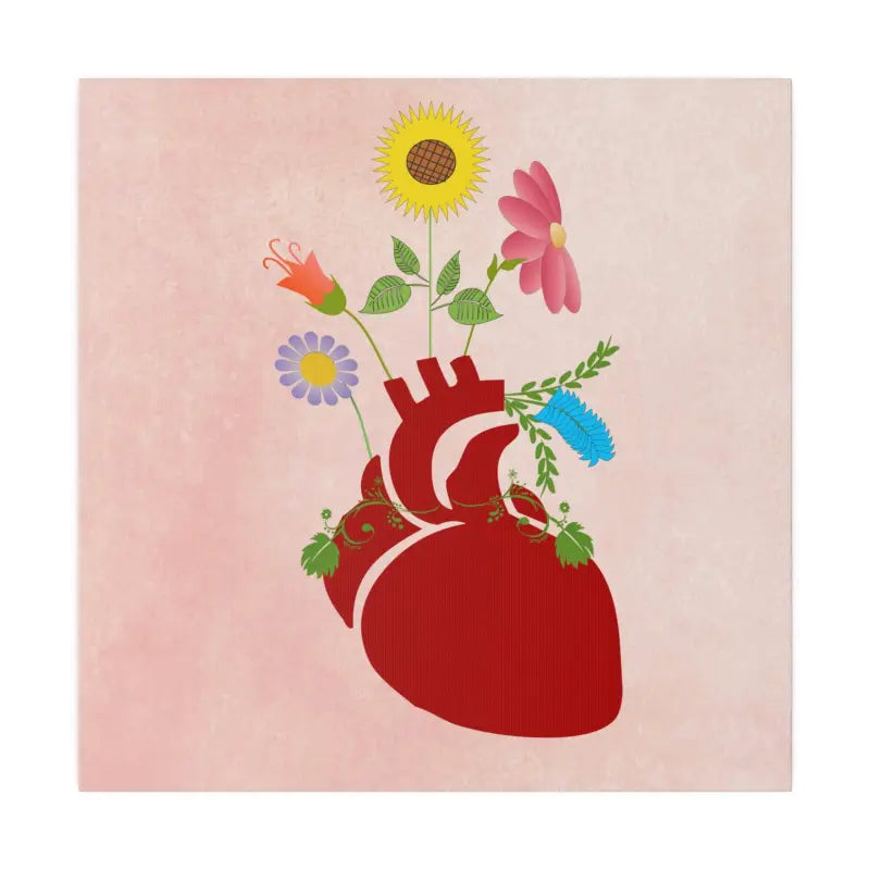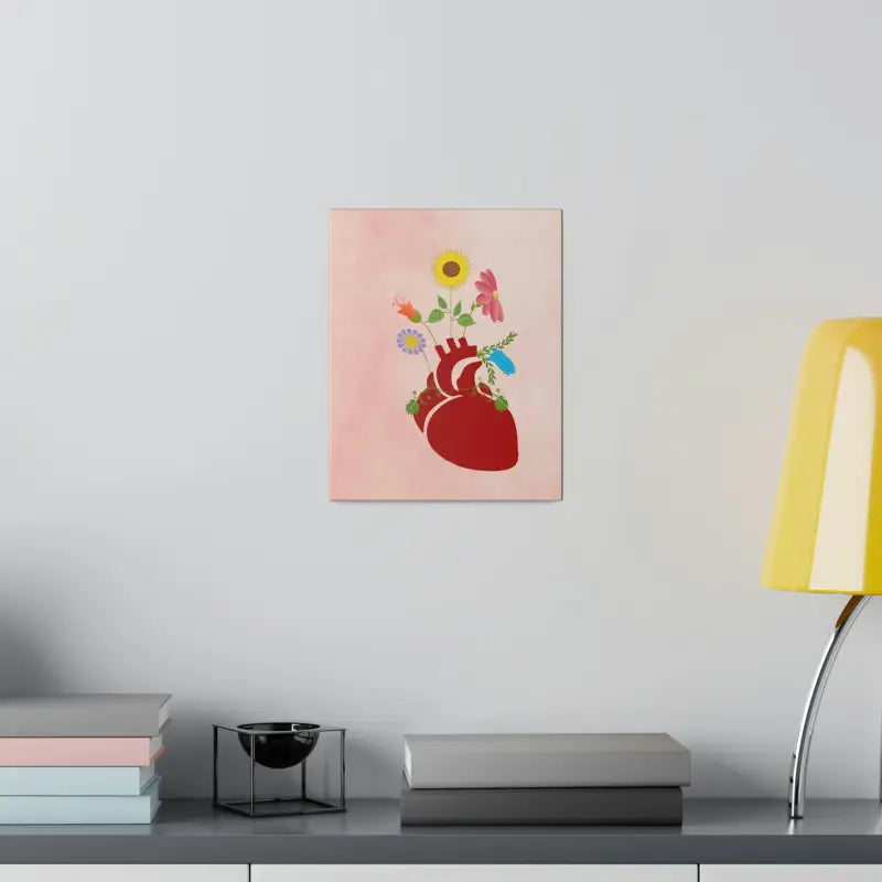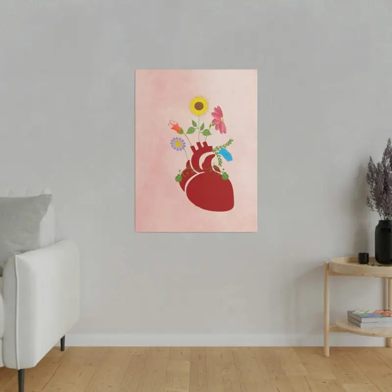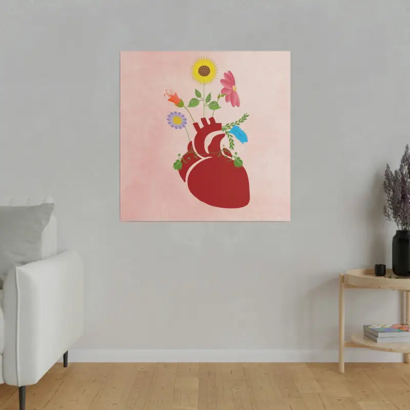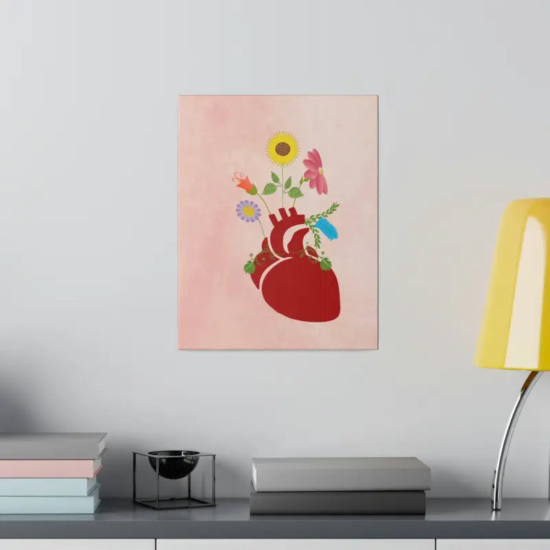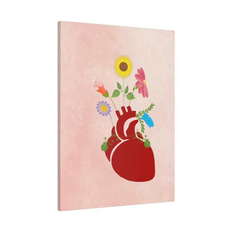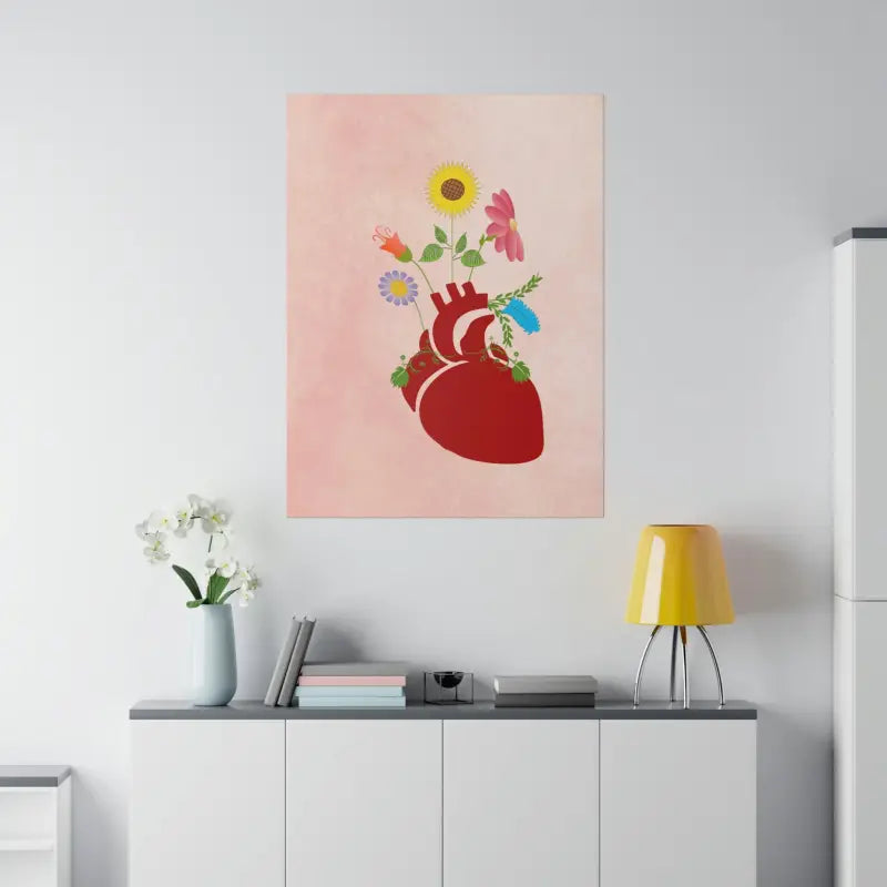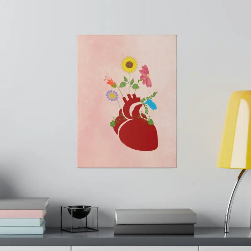 Print: Glowing heart entwined with bright blooms, strikingly detailed on matte canvas for standout depth and color.