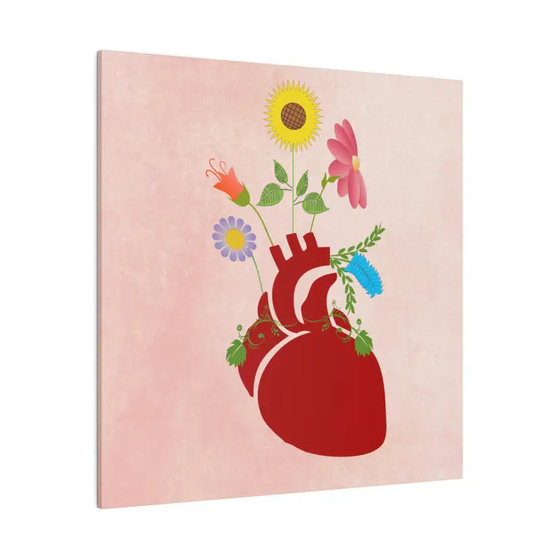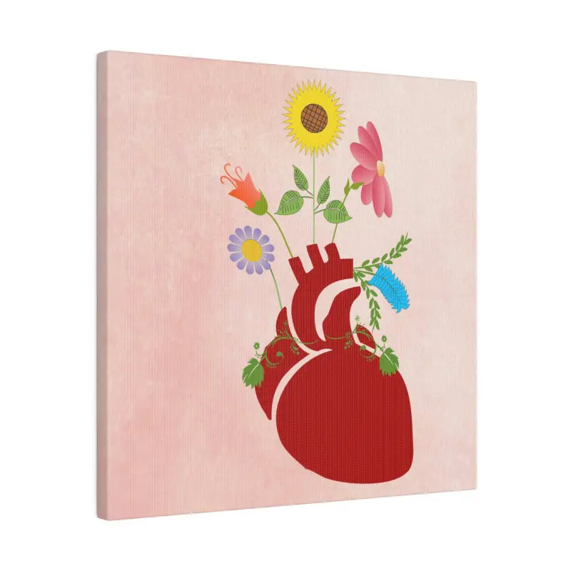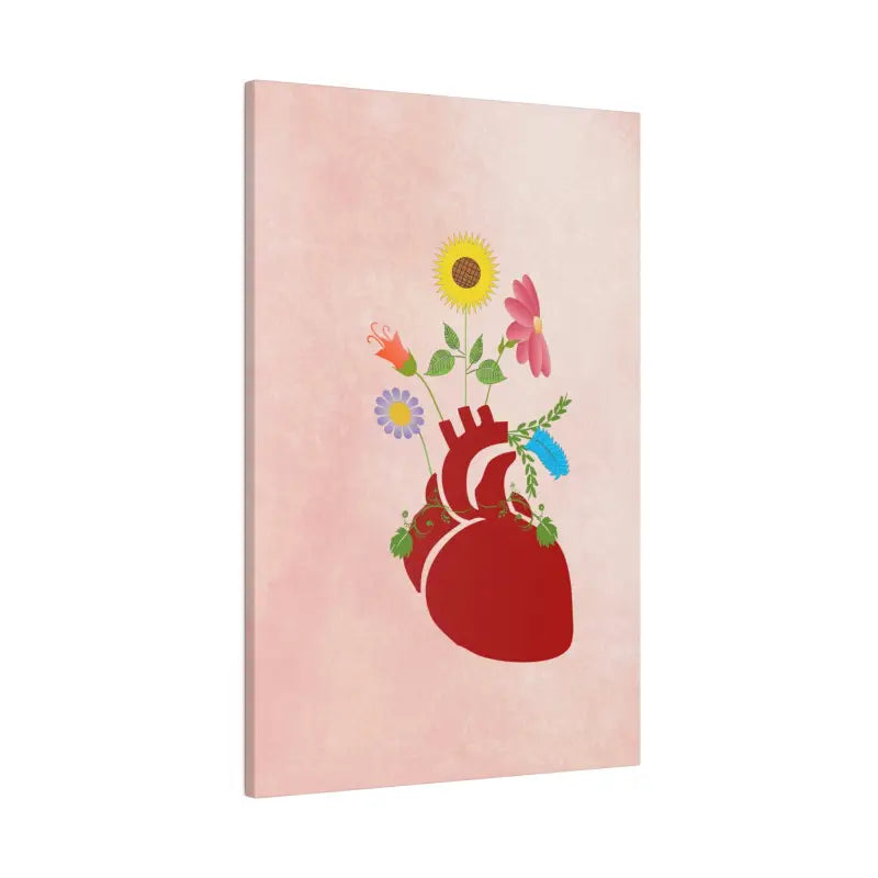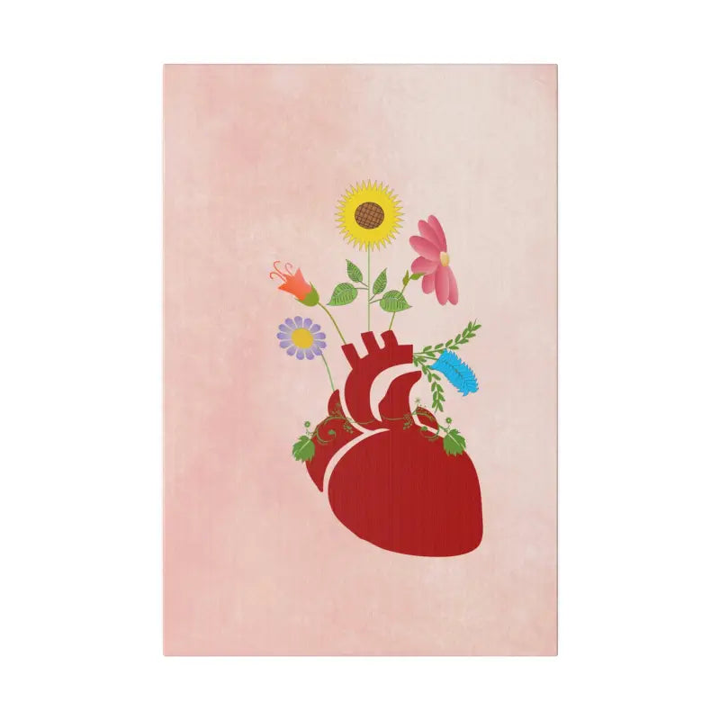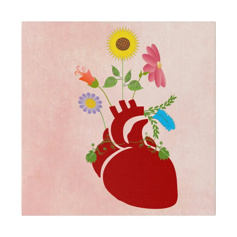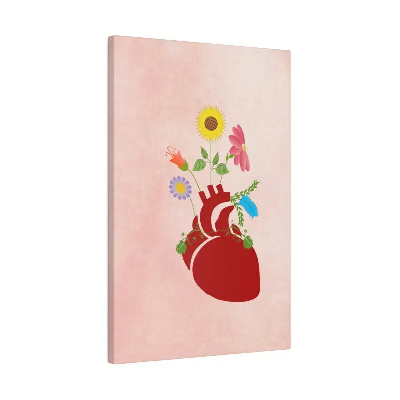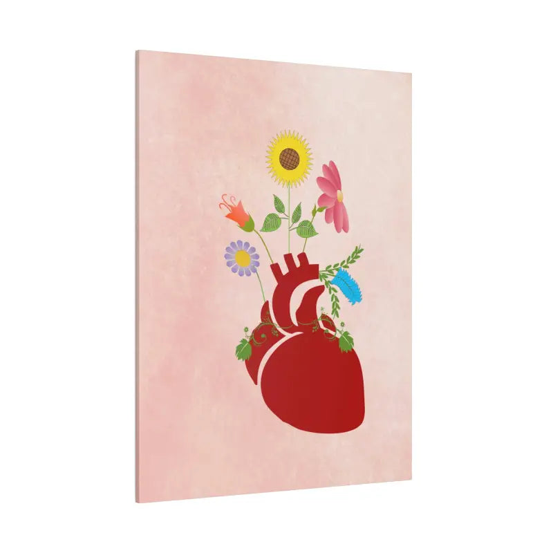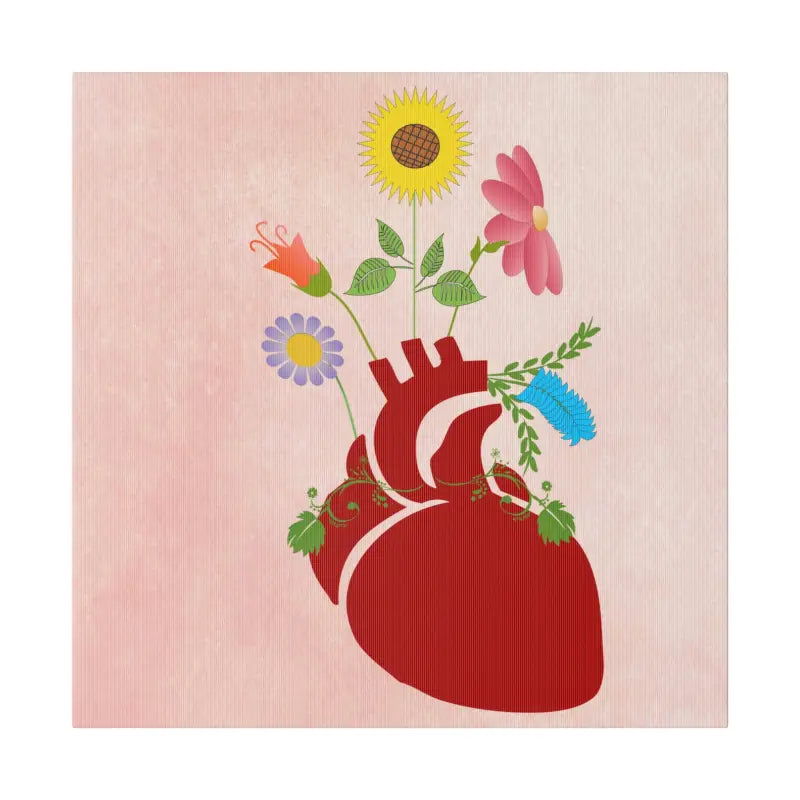 Print: Glowing heart entwined with bright blooms, strikingly detailed on matte canvas for standout depth and color.