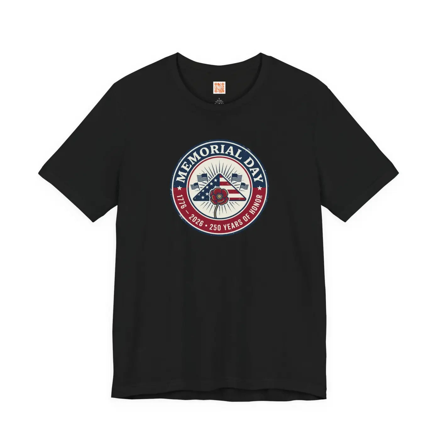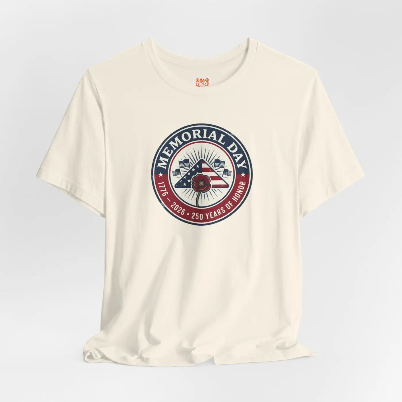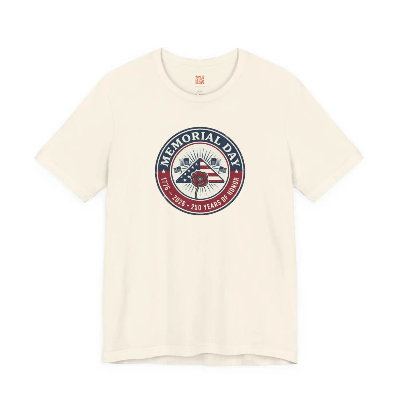 Vintage-inspired Memorial Day tee marking USA 250 (1776–2026) with a distressed circular crest in red, white, and navy. The artwork pairs classic patriotic typography and an emblem-style layout to evoke nostalgic Americana—balanced and reflective rather than flashy. Worn to observances, parades, or neighborhood gatherings, it reads as a commemorative identifier that connects wearers to the semiquincentennial moment. Product features - 100% Airlume combed and ring-spun cotton (Bella Canvas 3001), lightweight 4.2 oz/yd² - With side seams for structural support - Ribbed knit collar with seam and shoulder tape for shape retention - Tear-away label; age restrictions: for adults; REACH Certified - Sleeve and neck label printing via DTF/DTG depending on provider Care instructions - Machine wash: cold (max 30C or 90F) - Non-chlorine: bleach as needed - Tumble dry: low heat - Iron, steam or dry: medium heat - Do not dryclean
