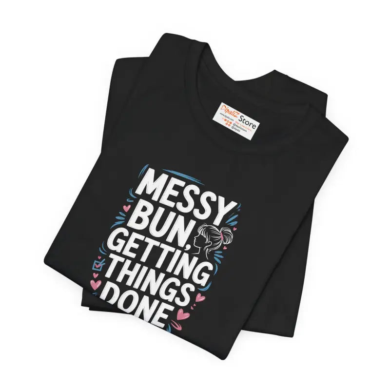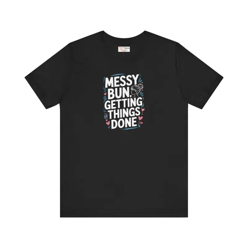 The vibrant and playful print features the words Messy Bun Getting Things Done in bold lettering, adding a touch of humor and charm to every look. Whether paired with jeans for a relaxed vibe or layered under a sweater when you're hustling through your day, this design stands out and invites smiles wherever you go. It’s a loving nod to all busy individuals who rock a carefree updo and still manage to crush their daily goals, making it an especially thoughtful gift for Mother’s Day.