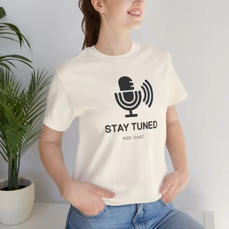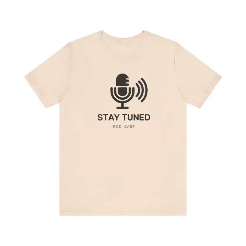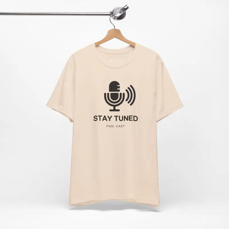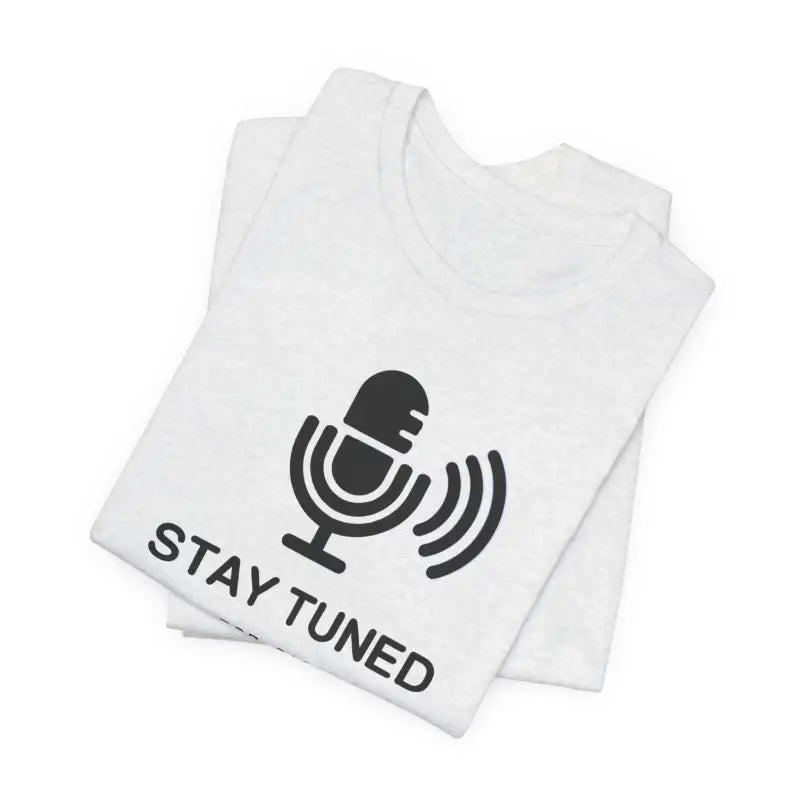 Microphone, Stay tuned, Unisex Jersey Short Sleeve Tee. This timeless unisex jersey short sleeve t-shirt offers a familiar and cherished feel. Its gentle cotton and premium print create an enduring affection among wearers. These shirts feature ribbed knit collars for enhanced structure and taped shoulders for lasting fit. The dual side seams further preserve the garment's form.