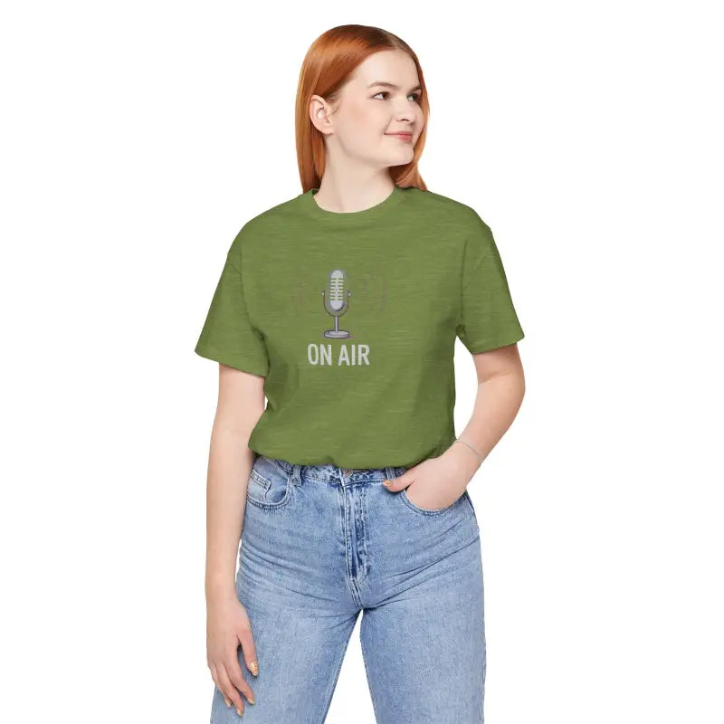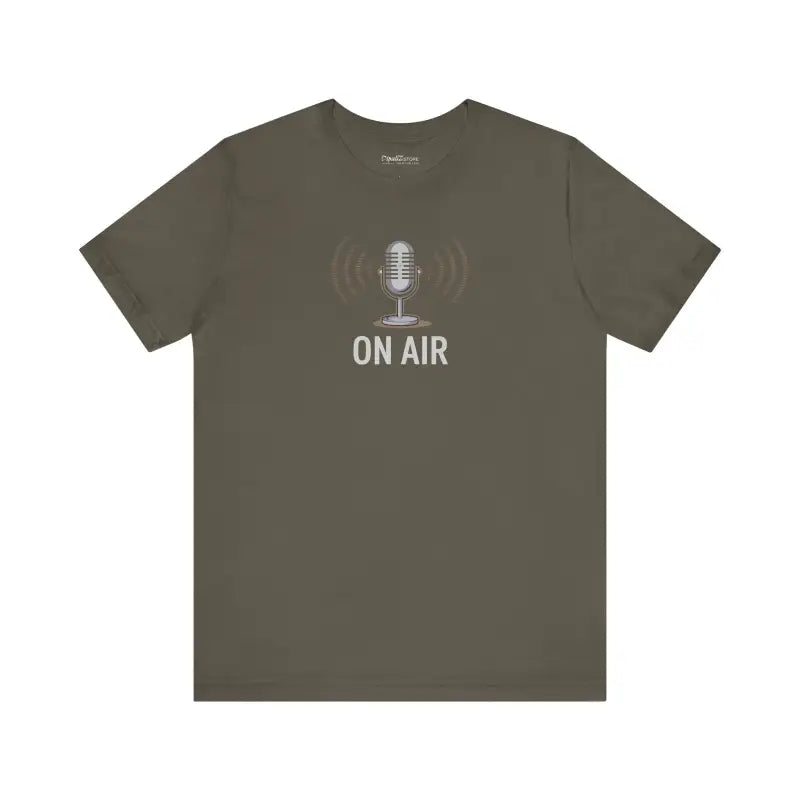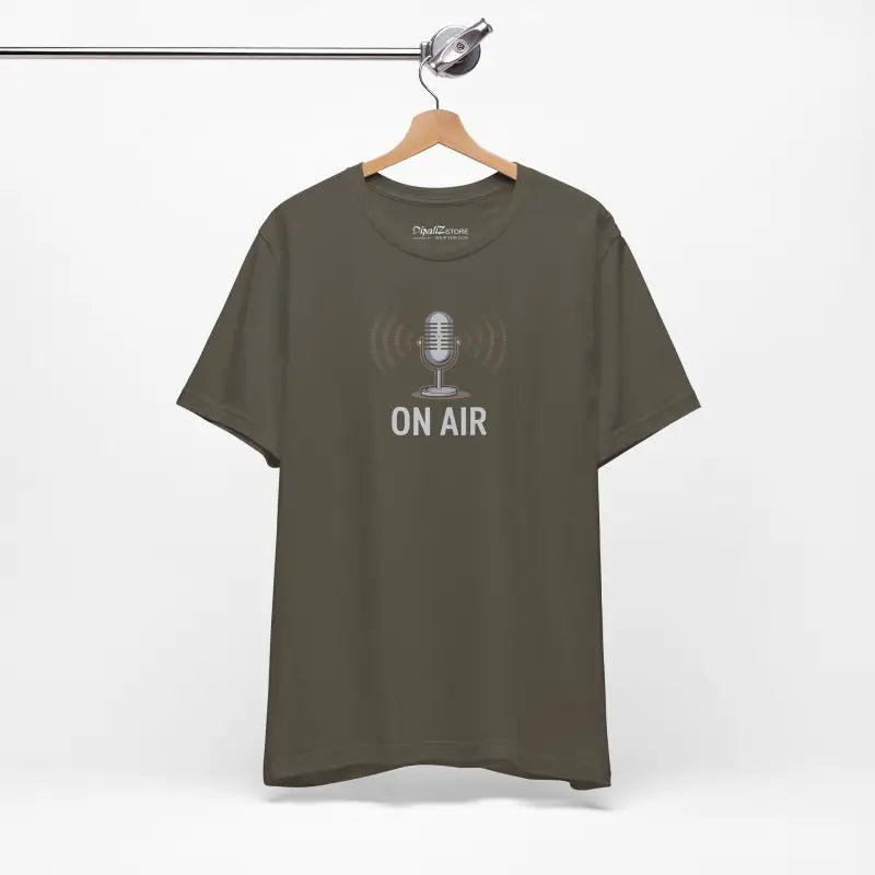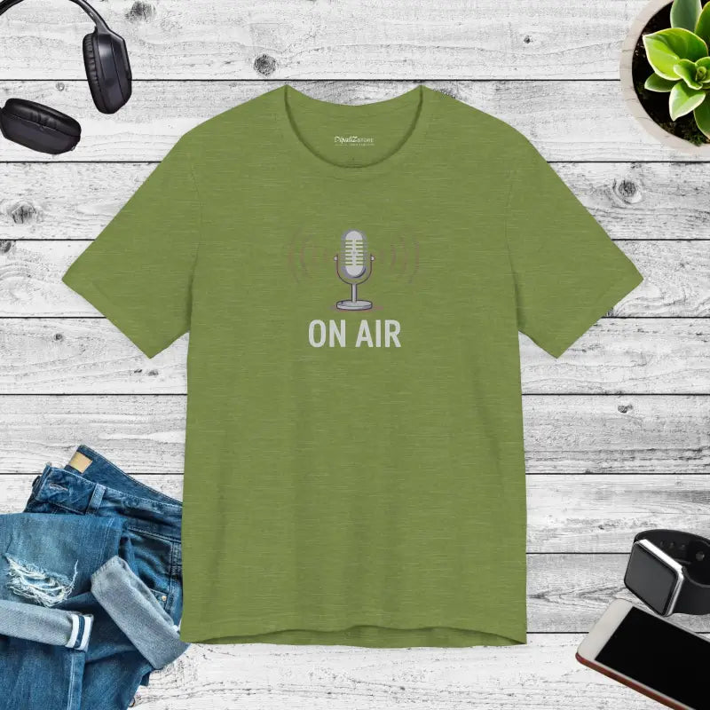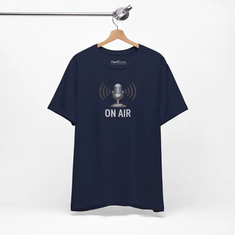Microphone with On Air text, podcast, Unisex Jersey Short Sleeve Tee. This timeless unisex jersey short sleeve t-shirt offers a familiar and cherished feel. Its gentle cotton and premium print create an enduring affection among wearers. These shirts feature ribbed knit collars for enhanced structure and taped shoulders for lasting fit. The dual side seams further preserve the garment's form.