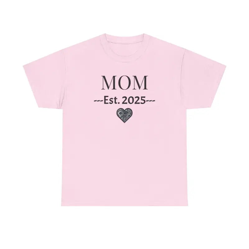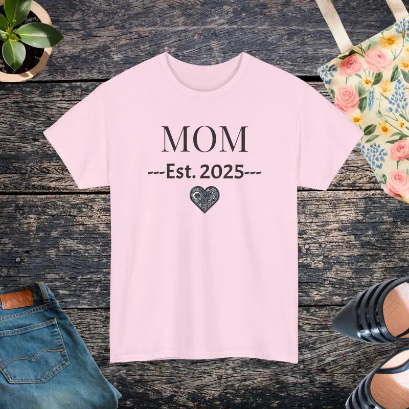 Mom Established 2025, new mom, Unisex Heavy Cotton Tee. The unisex heavy cotton tee is the basic staple of any wardrobe. It is the foundation upon which casual fashion grows. The specially spun fibers provide a smooth surface for premium printing vividity and sharpness. No side seams mean there are no itchy interruptions under the arms. The shoulders have tape for improved durability.