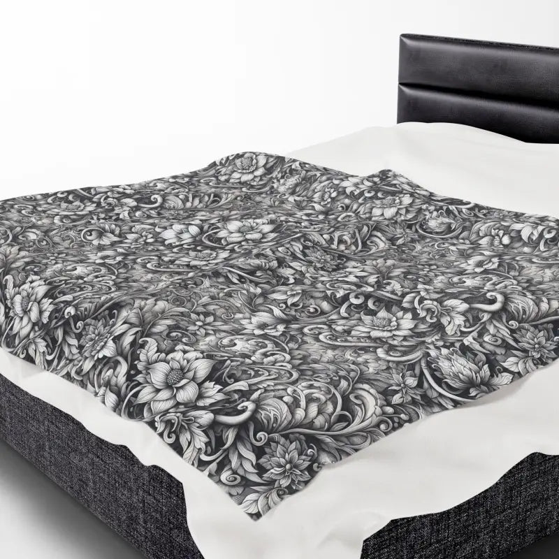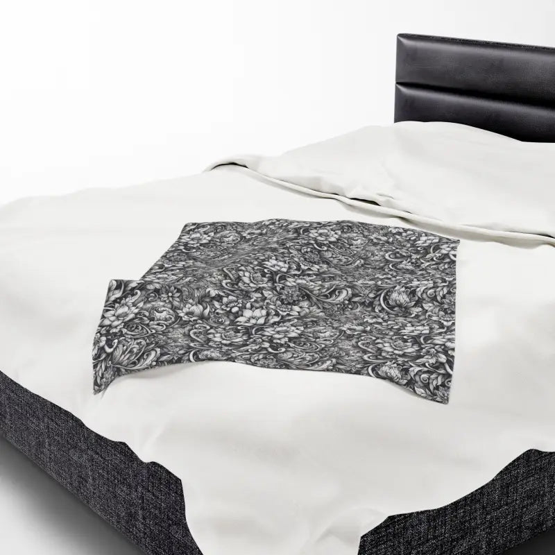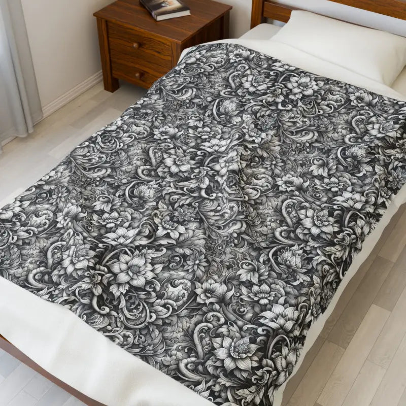 Velveteen Plush Blanket - Monochrome Floral Pattern - DipaliZ