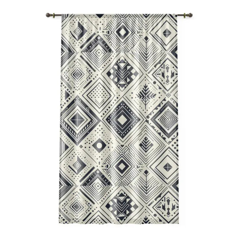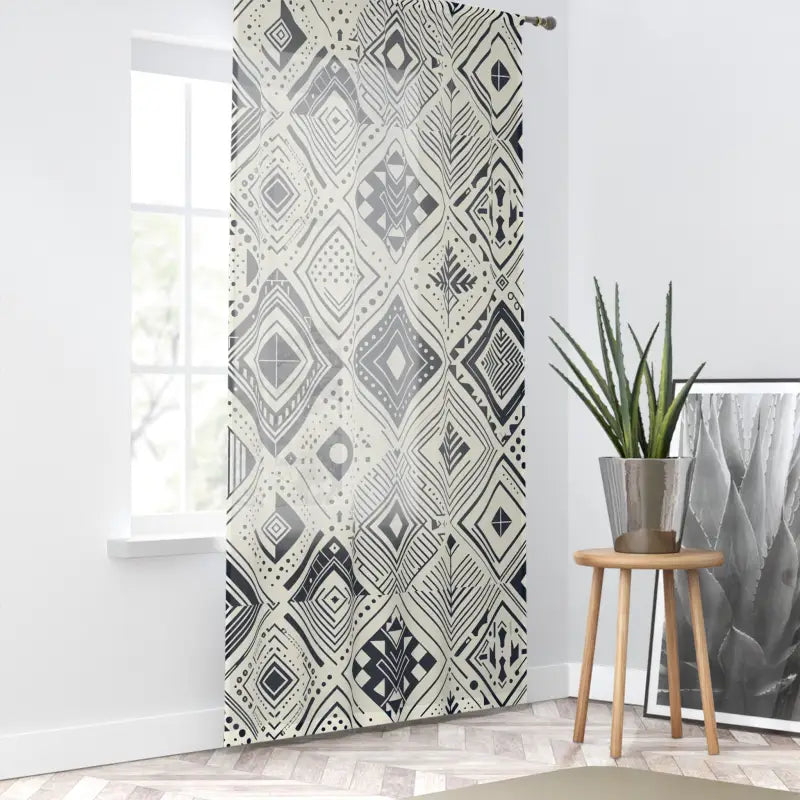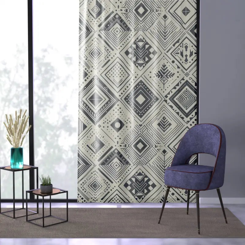 Monochrome geometric pattern, Window Curtain. Home decor - the one factor that can make a house truly feel like home. Add character to any type of surroundings with these beautiful curtains. Measuring in at 50" by 84", these curtains can decorate your window with unique artwork. Made 100% with polyester, they're somewhat transparent so as to soften outside light and add elegance to the room.