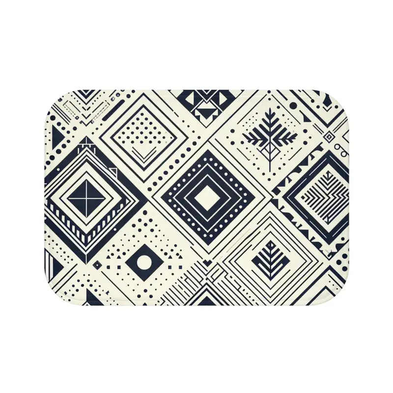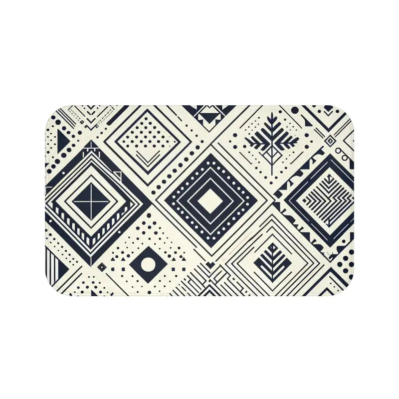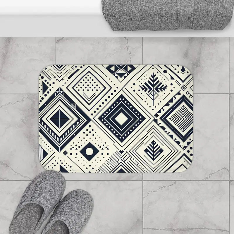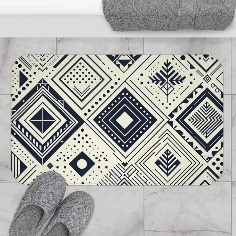 Monochrome geometrical pattern, Bath Mat. Beautiful mat for the most private room in one's house. This bath mat is as practical as it is stylish - the anti-slip backing keeps the bath mat firmly in place and reduces the risk of slipping.