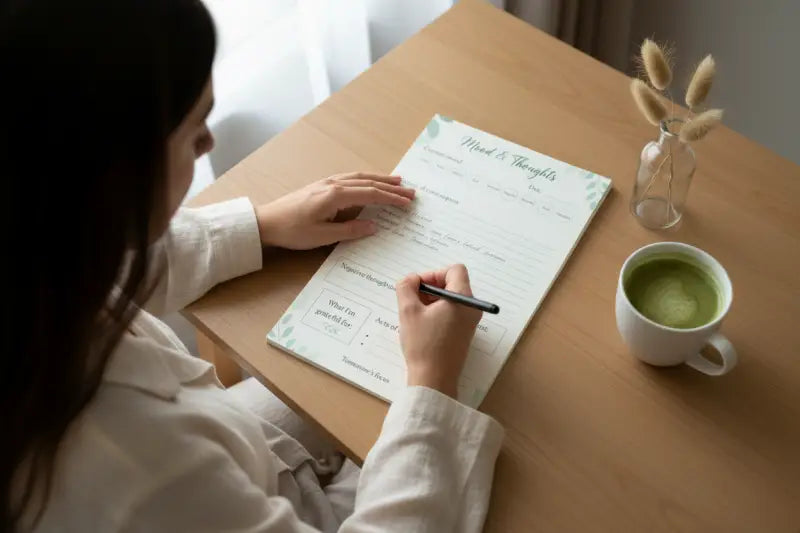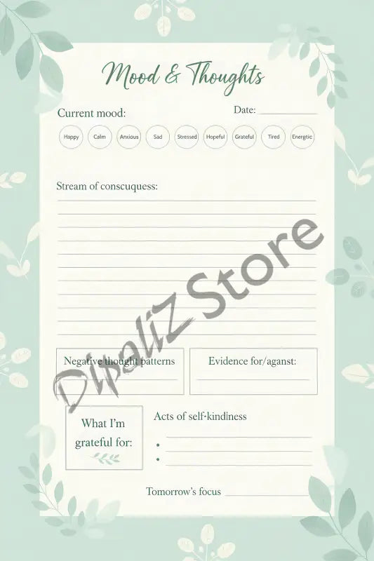 This beautifully designed journal printable gives you everything you need to understand your emotional landscape. Track nine distinct moods from Happy to Anxious, capture stream-of-consciousness thoughts, and dig deep into negative patterns with evidence-based analysis sections. The gratitude prompts and self-kindness tracker create positive momentum while tomorrow's focus area keeps you moving forward with intention.