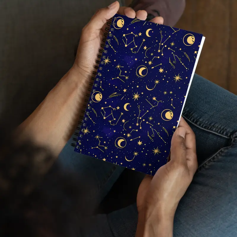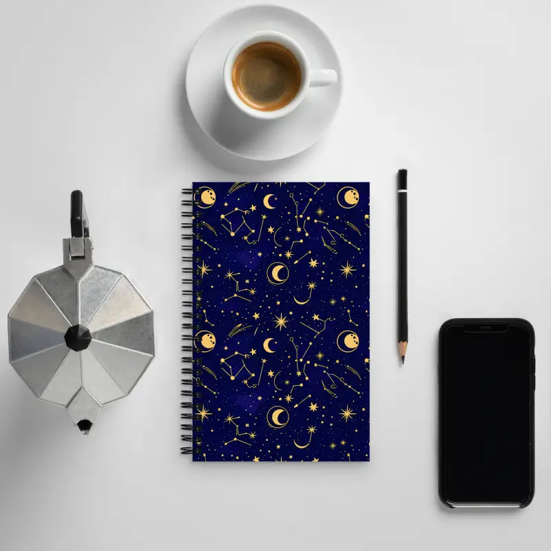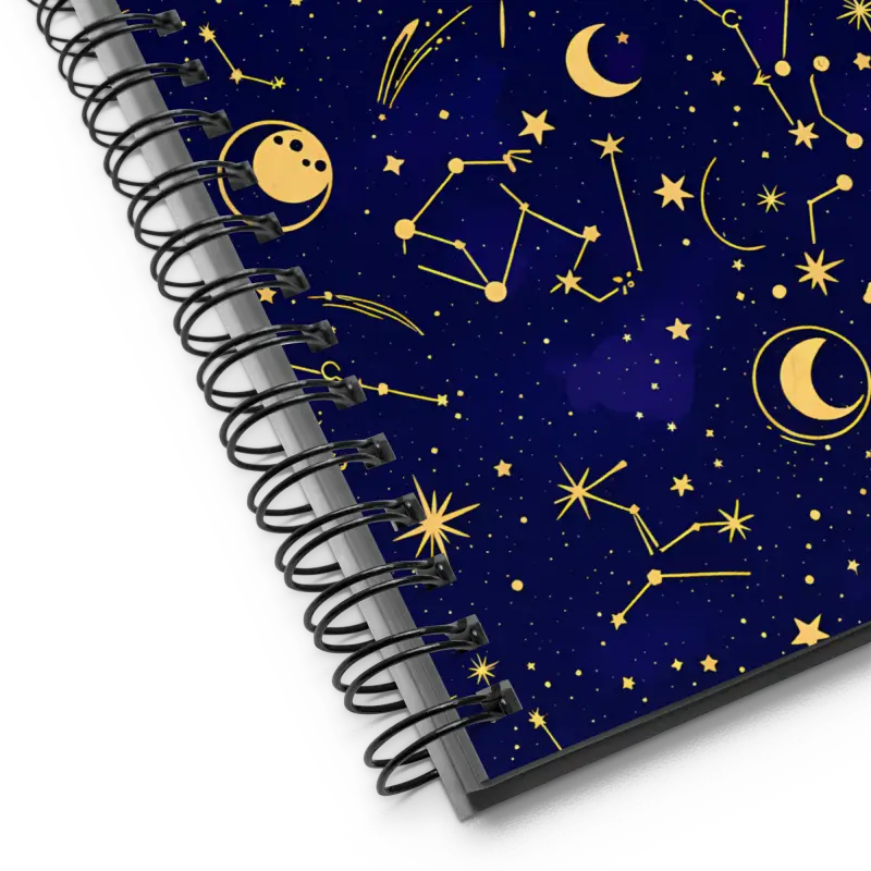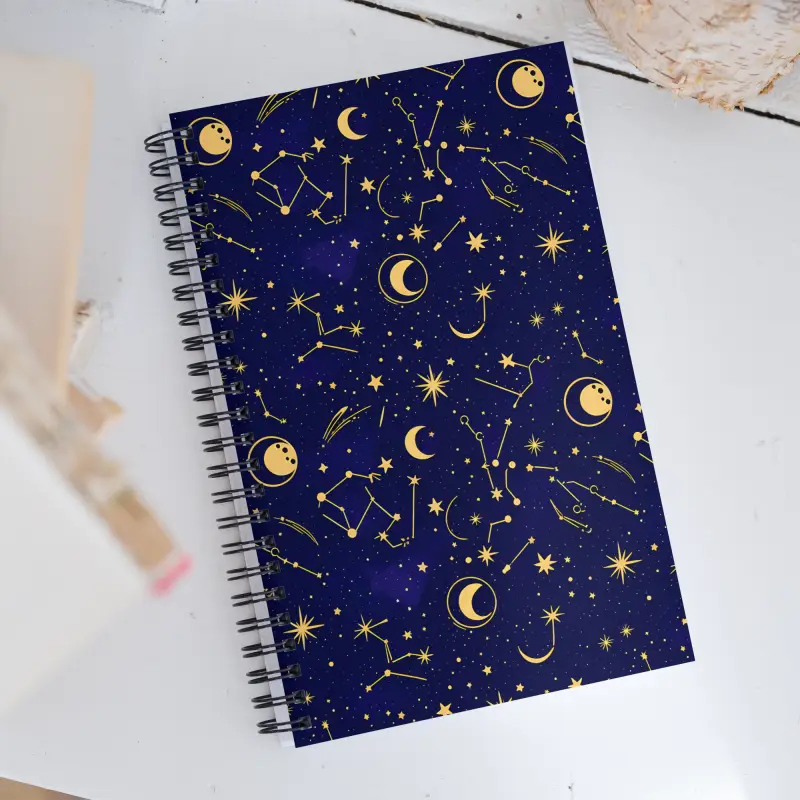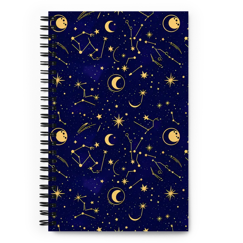 Dotted with glowing moons, glittering stars, and delicate constellations, this design turns everyday note-taking into a celestial ritual. The sturdy spiral binding keeps your thoughts aligned, while smooth pages invite you to write freely, plan boldly, and create endlessly.