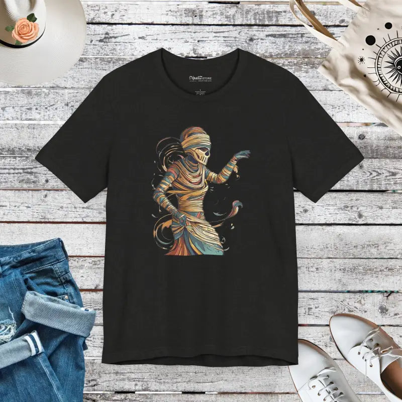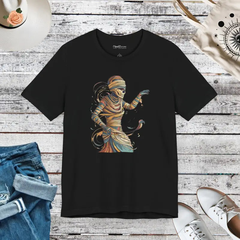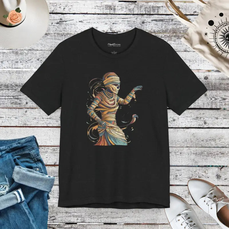 In the world of Halloween apparel, this tee stands out like a full moon on a clear night. Join the ranks of fellow fiends who know how to keep the fright-filled fun while remaining super stylish and cozy. This tee is more than just a garment—it's a conversation starter, a mood setter, and most importantly, a wardrobe essential for every Halloween enthusiast. Don’t let this season pass you by without grabbing this hauntingly fashionable piece that promises to keep you looking sharp and feeling awesome. Make your Halloween legendary with the Freaky Mummy Unwrapping Short Sleeve Tee—you won’t regret it!