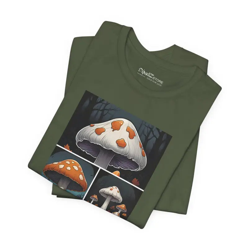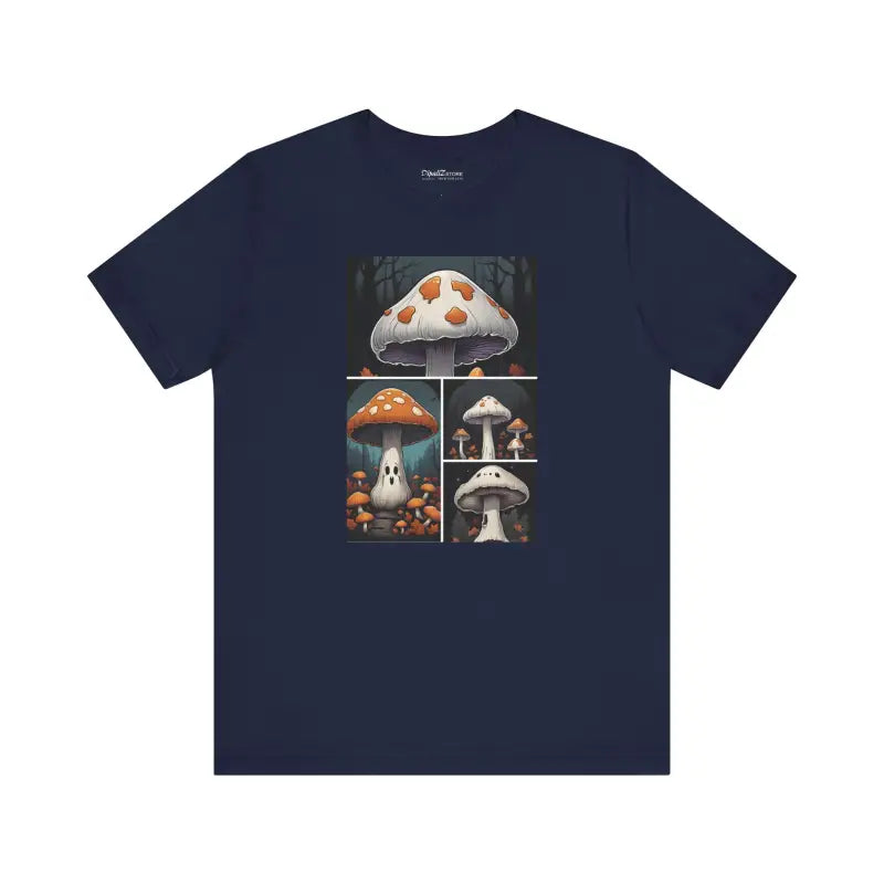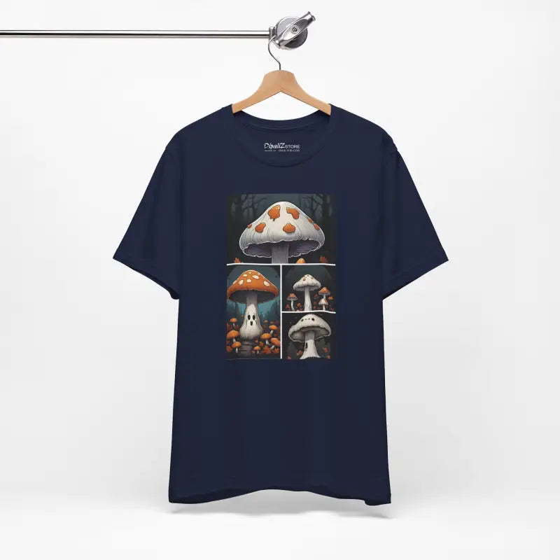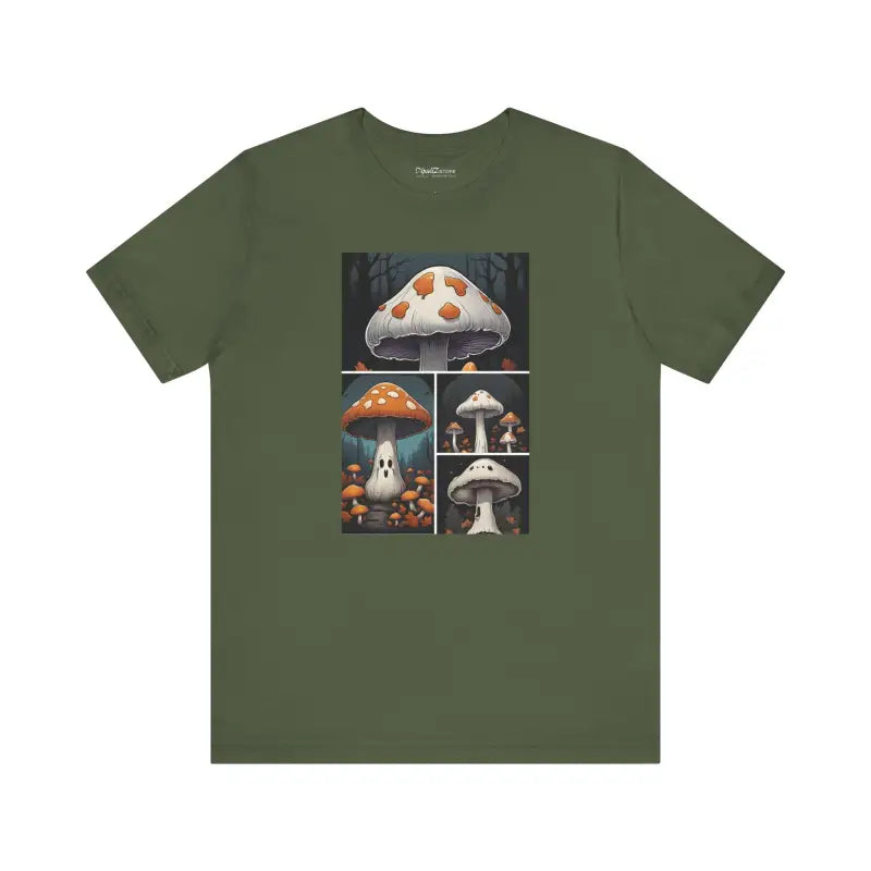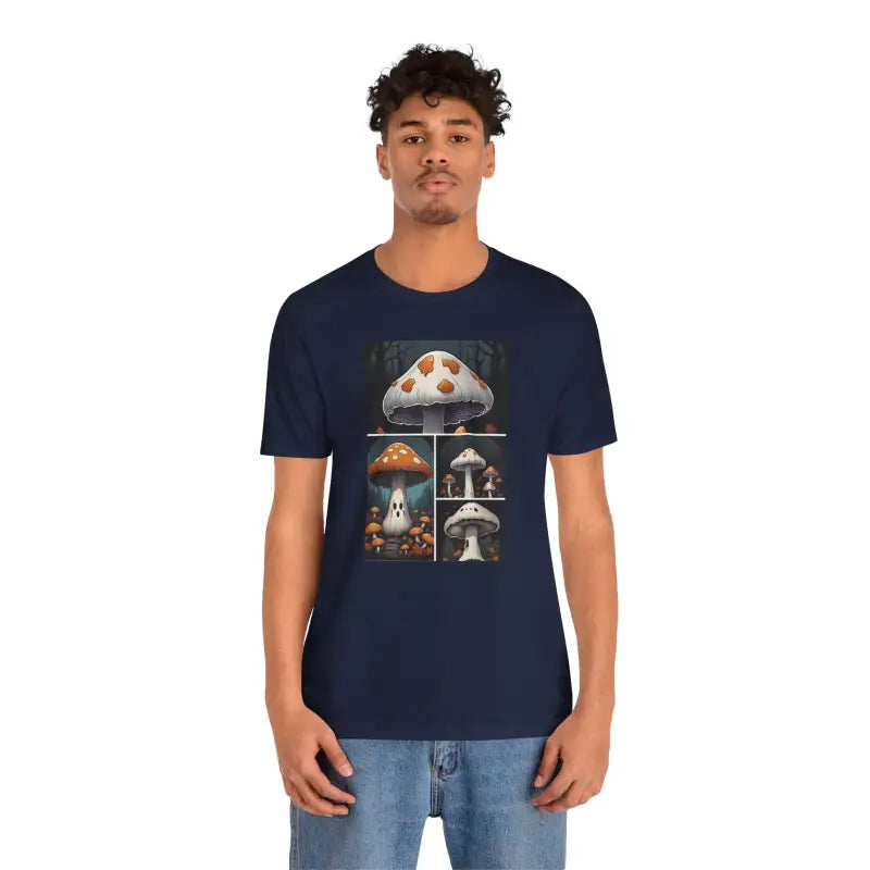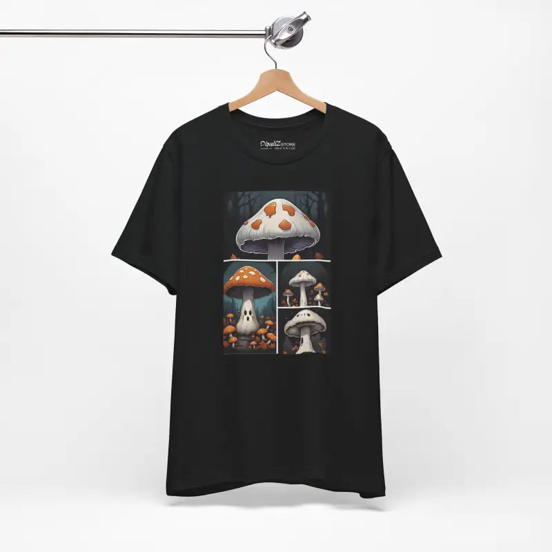 Mushrooms in the forest, Halloween, Unisex Jersey Short Sleeve Tee. This classic unisex jersey short sleeve tee fits like a well-loved favorite. Soft cotton and quality print make users fall in love with it over and over again. These t-shirts have-ribbed knit collars to bolster shaping. The shoulders are tapered for a better fit over time. Dual side seams hold the garment's shape for longer.