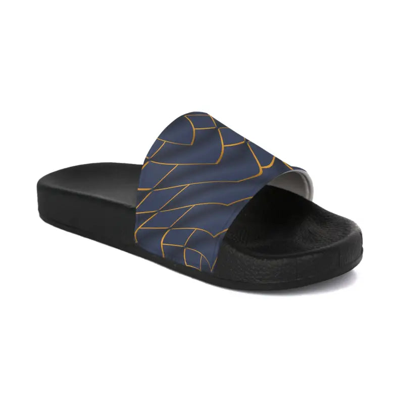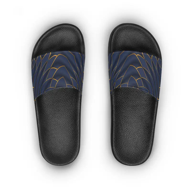 Step into summer sophistication with these stunning navy blue slide sandals that blend timeless elegance with modern comfort. The luxurious golden pattern dancing across the straps catches the light with every step, transforming a simple walk into a fashion statement that turns heads wherever you go.