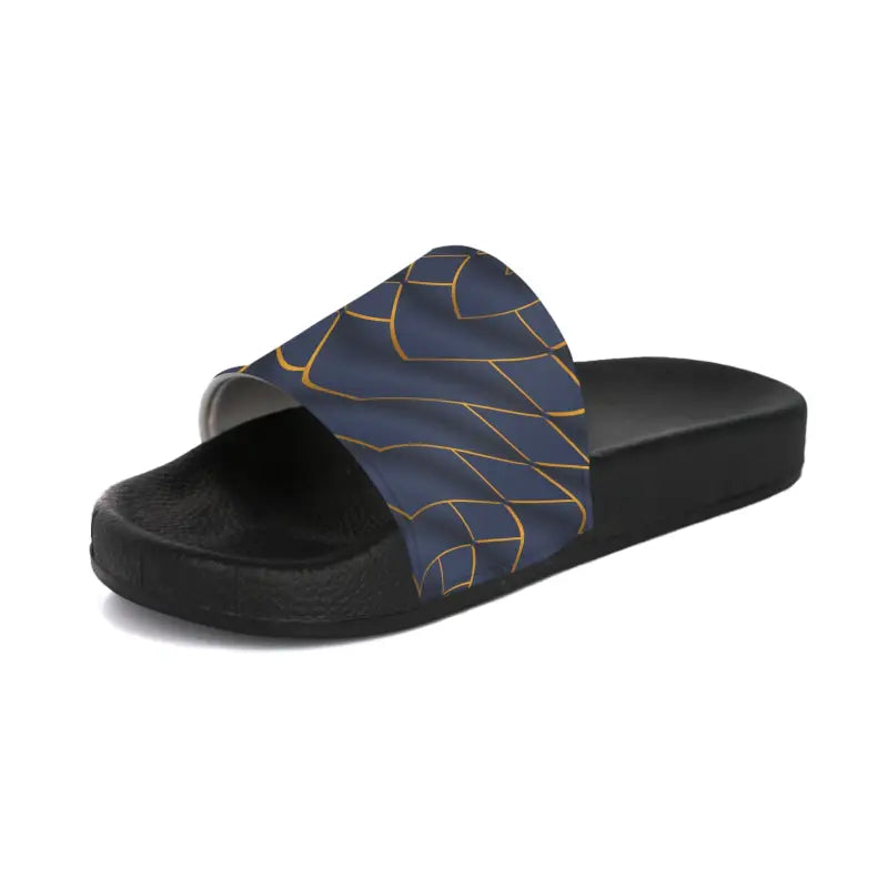 Picture yourself gliding through sun-drenched days in these gorgeous navy blue beauties adorned with shimmering golden accents. The rich deep blue creates a versatile foundation that pairs effortlessly with everything from flowing sundresses to casual denim shorts, while the metallic golden pattern adds that perfect touch of glamour. These slide sandals feature an eye-catching design that bridges the gap between casual comfort and elevated women's fashion, making them your new go-to footwear for virtually any warm-weather occasion.