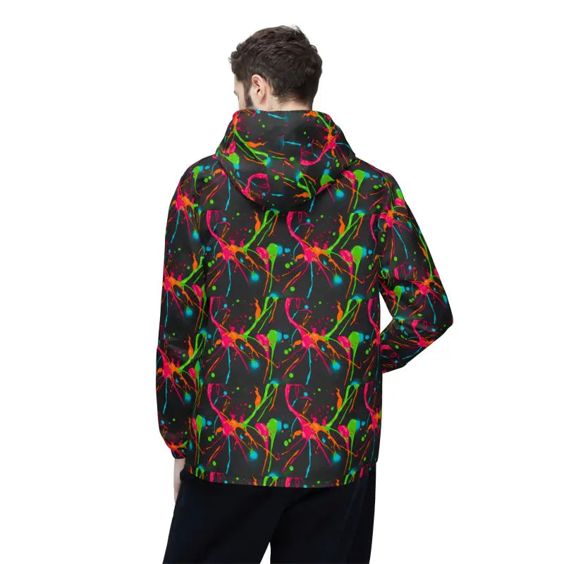 The psychedelic paint-splatter design isn't just decoration—it's a declaration that you live loud and move fast. Each neon splash looks like it was captured the instant it hit the surface, with drips and arcs that create genuine movement and energy across the entire jacket. This isn't some timid pattern hiding in the seams; it's full-coverage visual chaos that tells everyone you meet that you value creativity, spontaneity, and standing out over fitting in. The contrast between the deep black base and those fluorescent colors creates depth that catches light from every angle, making you visible and vibrant even in low-light situations.