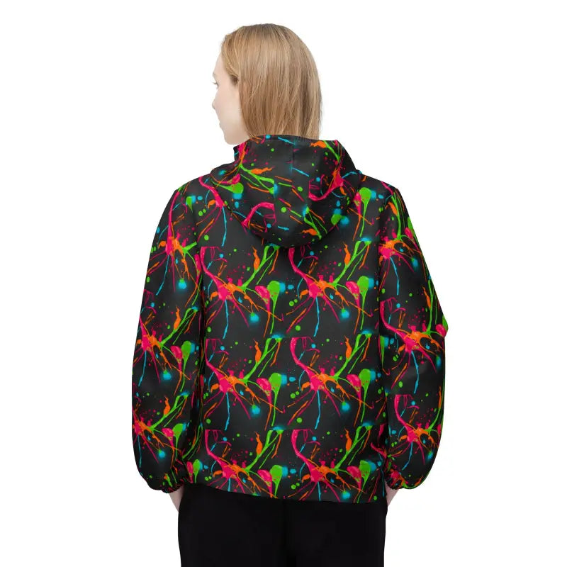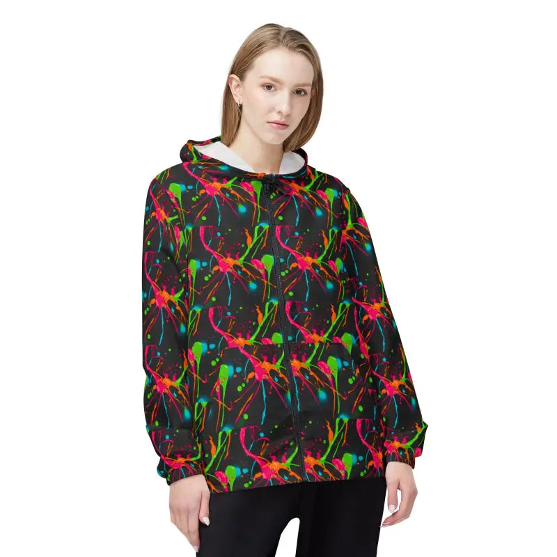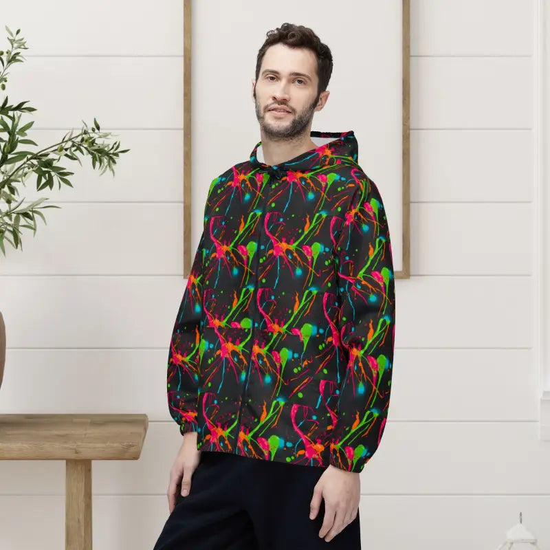 Picture this: you step out into the night and the city lights hit your jacket like a second spotlight, turning heads before you even move. This neon splash windbreaker transforms you into a walking art installation, with explosive bursts of hot pink, acid green, and electric blue streaking across a midnight black canvas like someone threw paint bombs at a rave and froze the moment mid-explosion. The lightweight shell moves with you effortlessly, never weighing you down or holding you back, whether you're dancing through festival crowds or cutting through downtown on your board. Every time you zip up this splash windbreaker jacket, you're not just protecting yourself from the elements—you're announcing that you refuse to blend into the background. The fabric feels smooth against your skin with just enough structure to hold its shape without getting stiff or crunchy, and the relaxed fit gives you room to layer underneath without looking bulky or feeling restricted.