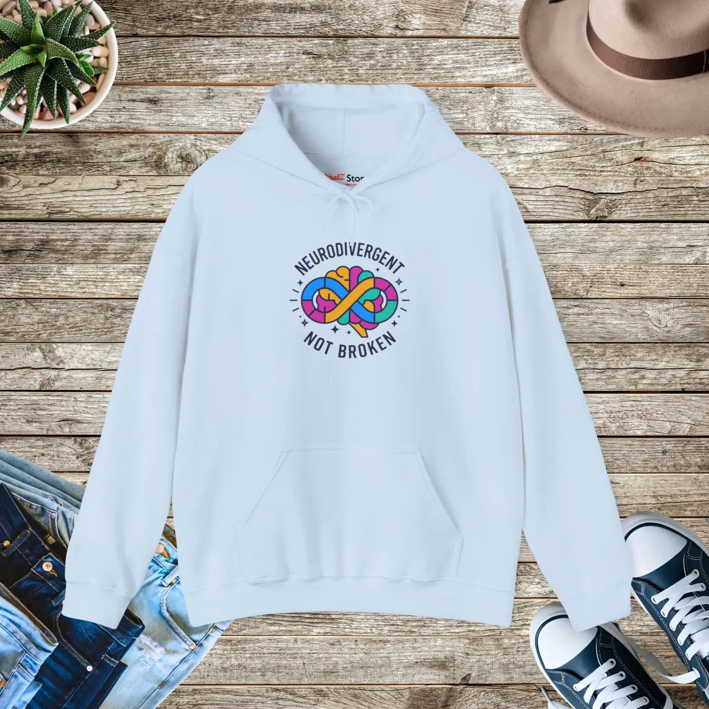 The design features a clear neurodiversity infinity knot in bright, balanced hues paired with the affirming phrase โNeurodivergent โ Not Broken.โ Made from a breathable, medium-weight blend, it offers a soft touch thatโs gentle on sensitive skin. The roomy pouch pocket and double-lined hood add extra coziness, making it ideal for those who value both style and sensory comfort. Plus, the eco-friendly gifts angle means youโre supporting sustainability with every wear.