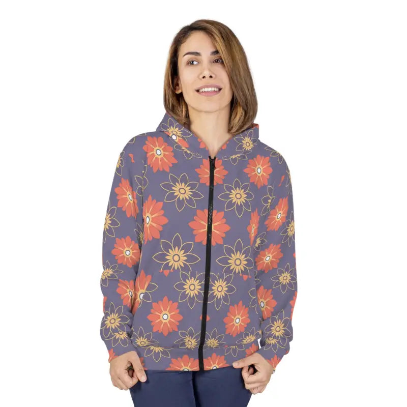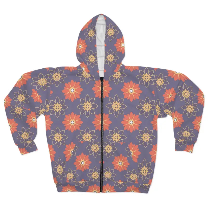 Make every chilly day a statement with this cozy unisex zip hoodie, bringing together eye-catching women’s fashion and comfort for everyone. The seamless all-over print with striking orange flowers delivers bold personality, effortlessly standing out in any crowd. With a purple unisex zip design, it fuses contemporary flair with classic cozy vibes—perfect for anyone who refuses to blend in.
