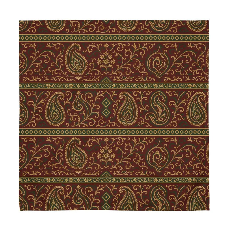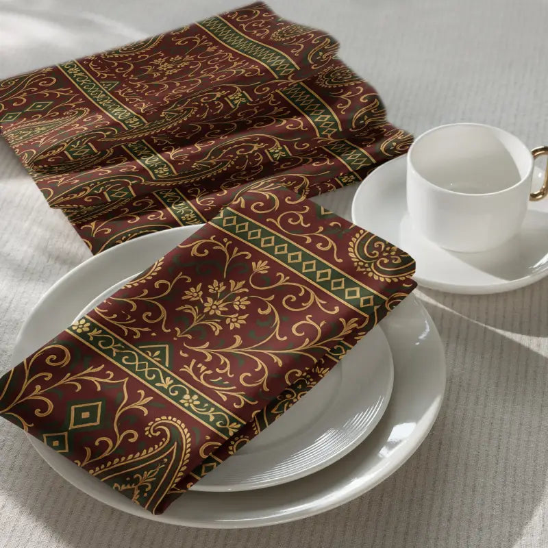 Print: The napkin set showcases an eye-catching paisley pattern on rich maroon hues that bring timeless charm and a lively twist to your dining space.