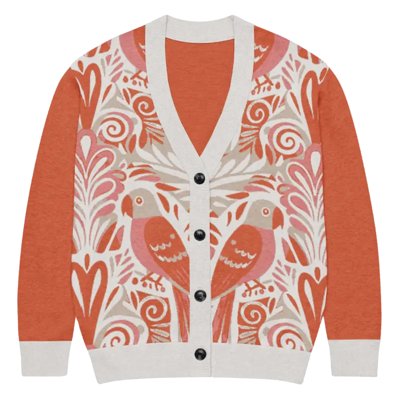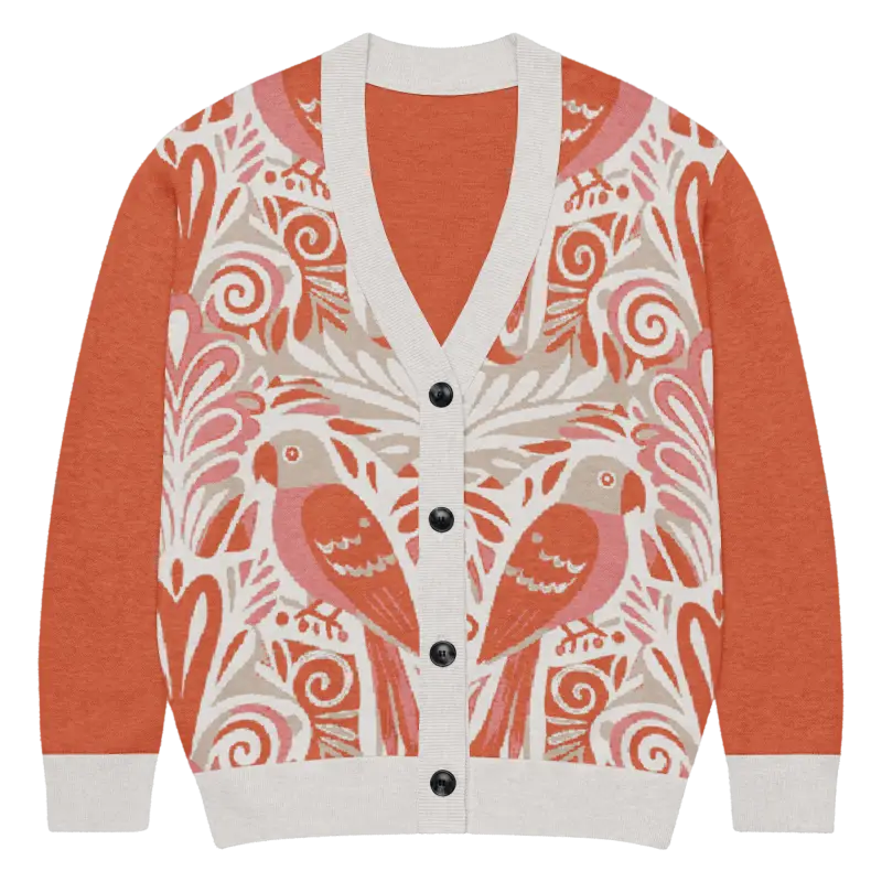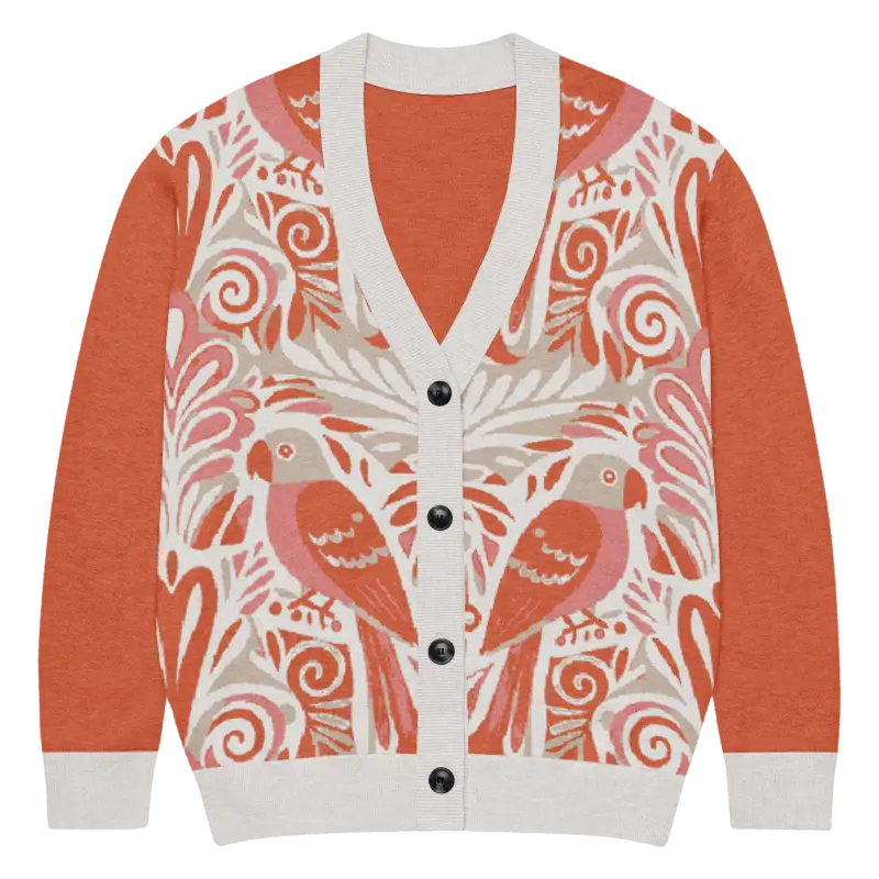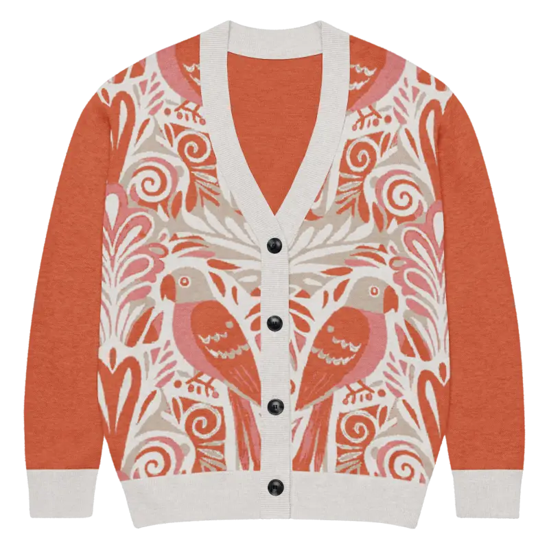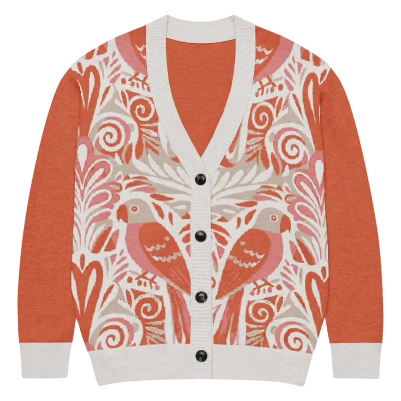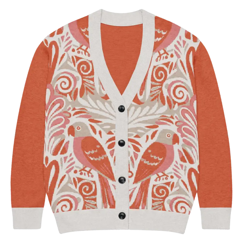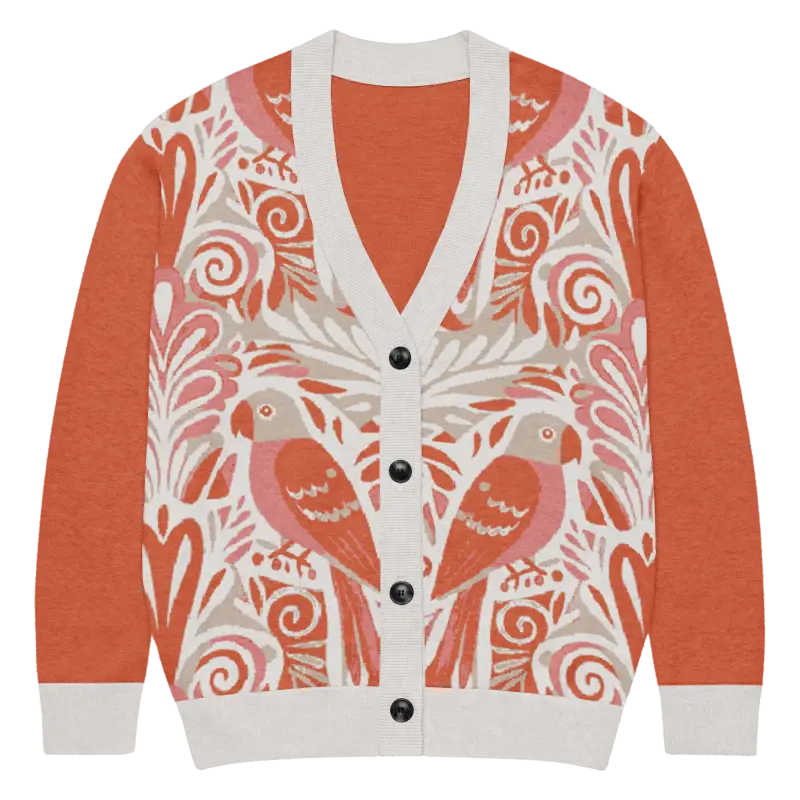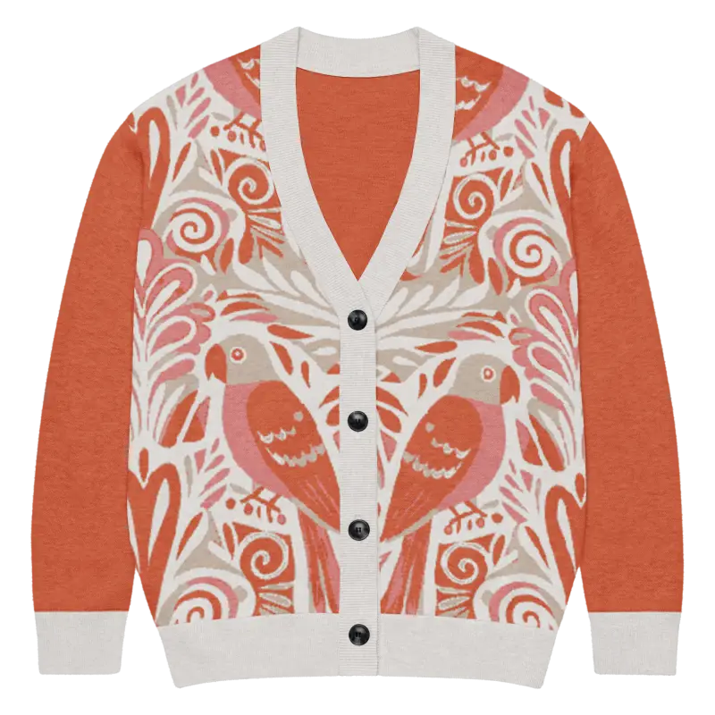 Get ready to fall in love with your new favorite layering piece from this online clothing store! This knitted cardigan brings tropical vibes straight to your wardrobe with its playful parrots print that turns heads wherever you go. The jacquard knit technique creates stunning texture while keeping things lightweight and breathable for year-round comfort.