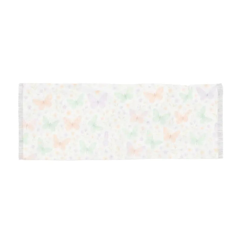 • Pastel butterfly motifs blend artful brushstrokes with subtle shimmer for a light scarf that feels like a wearable daydream