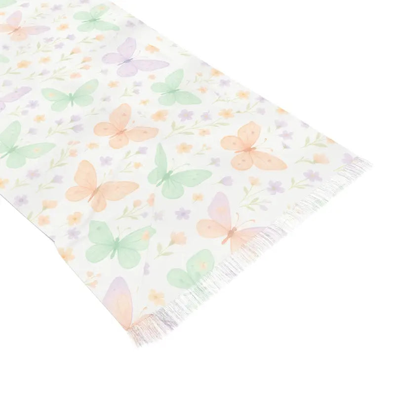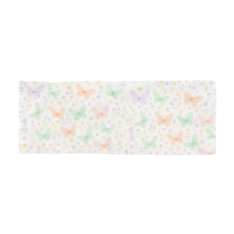 Soft swirls of pink, lavender, and mint trace delicate wings across a whisper-thin light scarf. Each pastel butterfly seems to soar in semi-translucent whispers, catching rays of light to create a gentle shimmer that brightens your day and sparks compliments wherever you go.