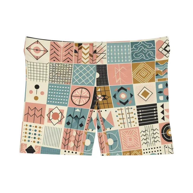 Pastel geometric pattern, Women's Shorts (AOP). These shorts were made to handle heat like champs thanks to their moisture-wicking fabric. Made with 95% Polyester and 5% Spandex, they balance perfectly between comfy and stretchy while remaining super soft to the touch. Each pair comes with white seam color and all-over-print capability.