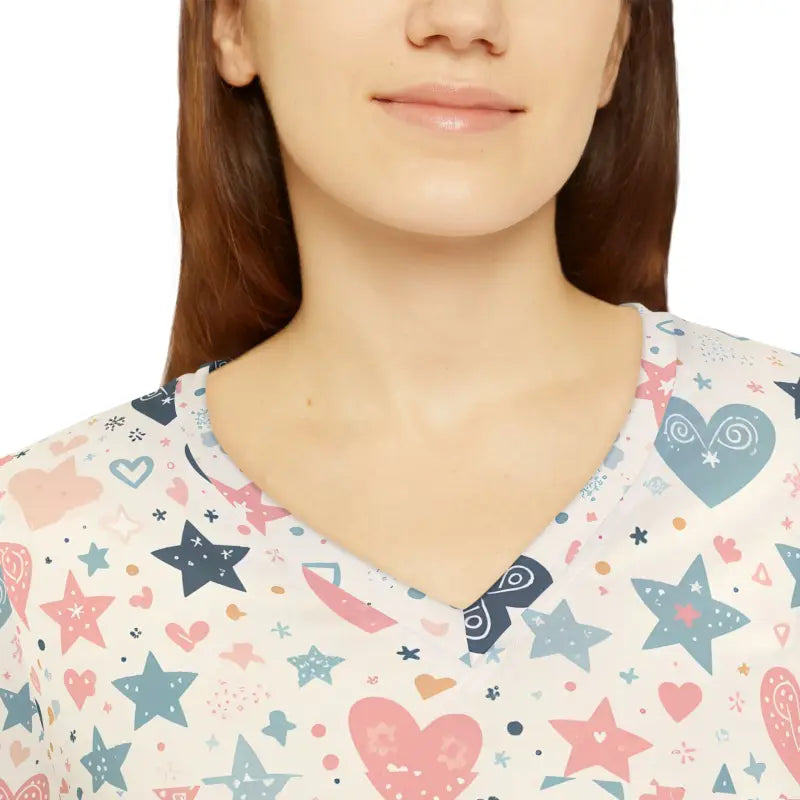 Don't let this wardrobe must-have slip away. Grab your Stylish Pastel Hearts Long Sleeve V-neck today and experience a blend of comfort and style that's truly irresistible!