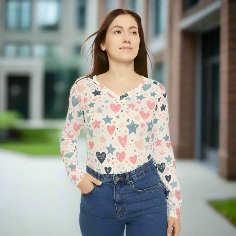 Elevate Your Style with Our Stylish Pastel Hearts Long Sleeve V-neck for Women