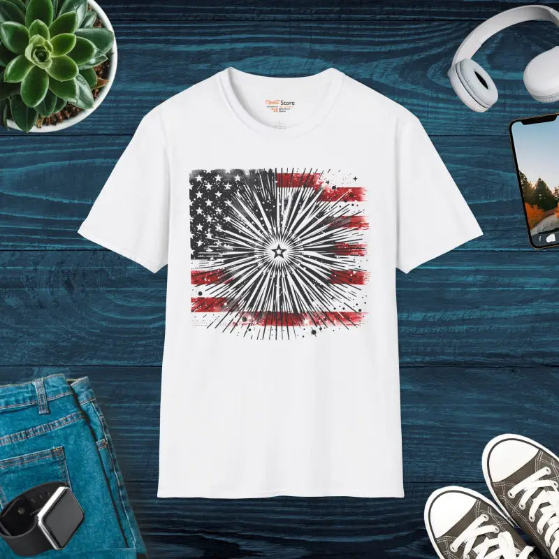 Print: Bold, vibrant patriotic graphic featuring timeless USA pride elements.