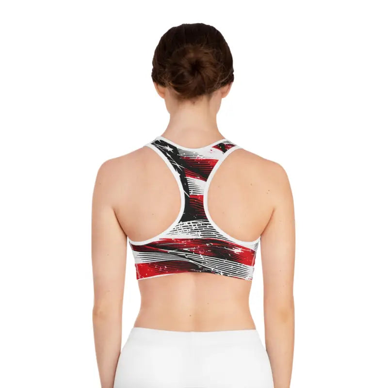 Print: Iconic all-over blue flag print with vibrant red and white details, making this patriotic sports bra a total showstopper.