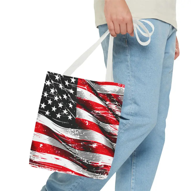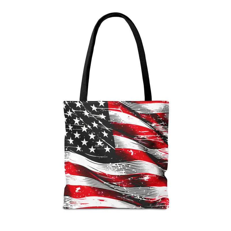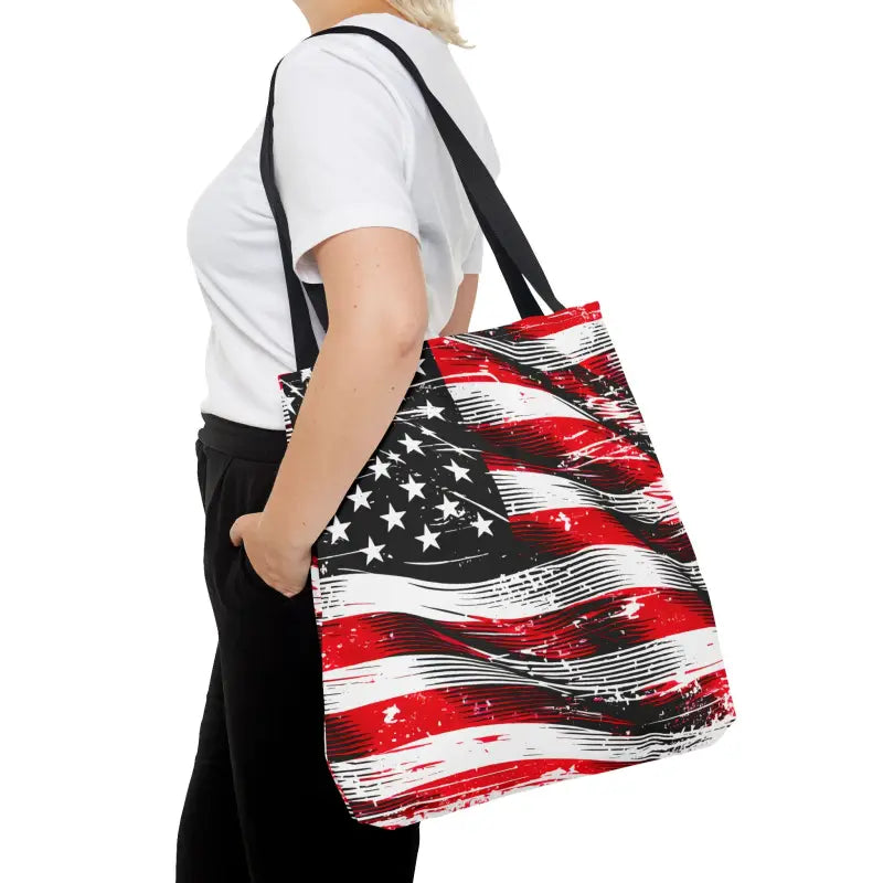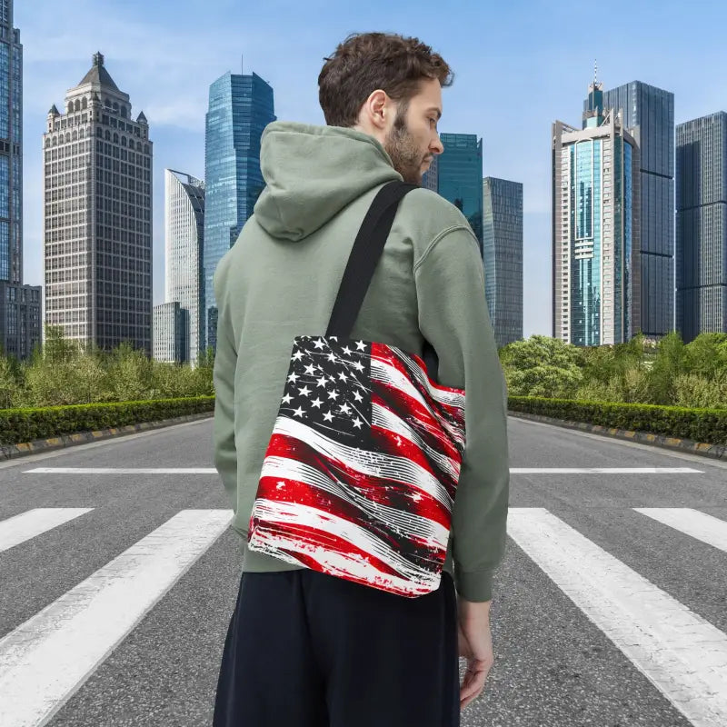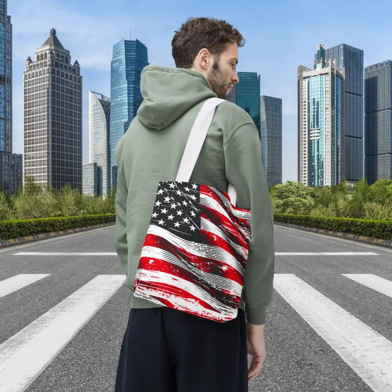 Step up your style game and let your patriotism shine wherever you go. With this bold American flag tote bag, you get durability, comfort, and an unmistakable flag design—so why not carry a bit of American spirit with you every day? Elevate your accessories and make this eye-catching tote bag yours today!