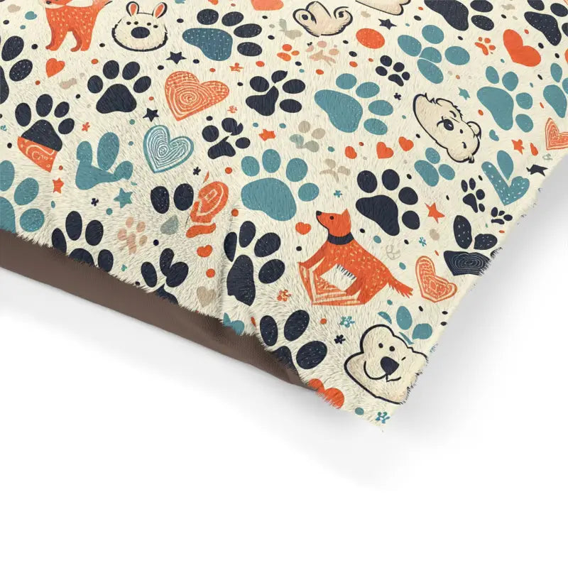 Our design is a unique blend of function and fun. The print on one side adds an artistic touch with its lively paw prints and dog-inspired motifs, creating an ambiance of joyful companionship. This pet bed is perfect for indoor spaces, from living rooms to bedrooms, offering your pet a designated area that enhances both home appeal and practicality. Not only does it provide a comfortable spot for lounging, it also makes a stylish statement that underscores your dedication to your pet’s well-being. The contrasting dark brown zippered back adds a touch of sophistication, ensuring that pet bed fits effortlessly into modern home settings.