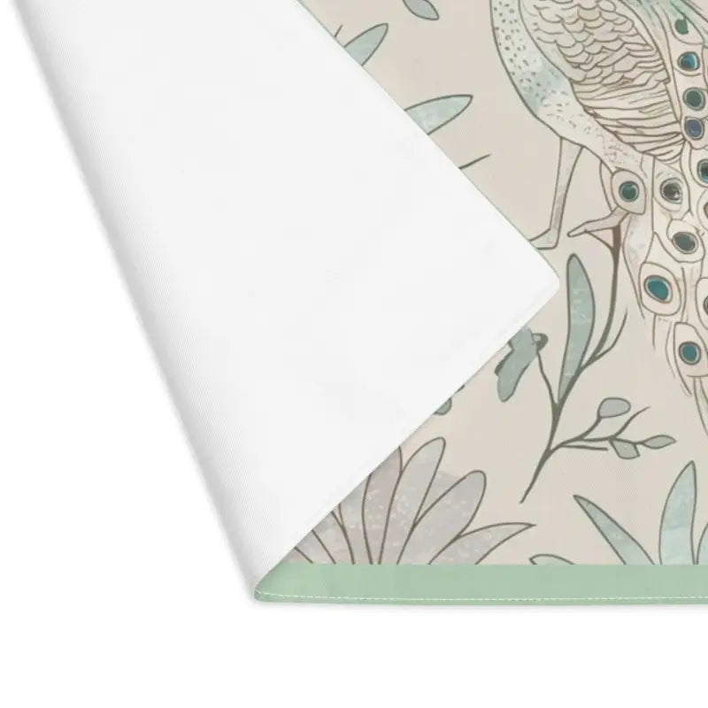 - One-sided peacock print with a natural cotton back creates a versatile and sophisticated table accent.